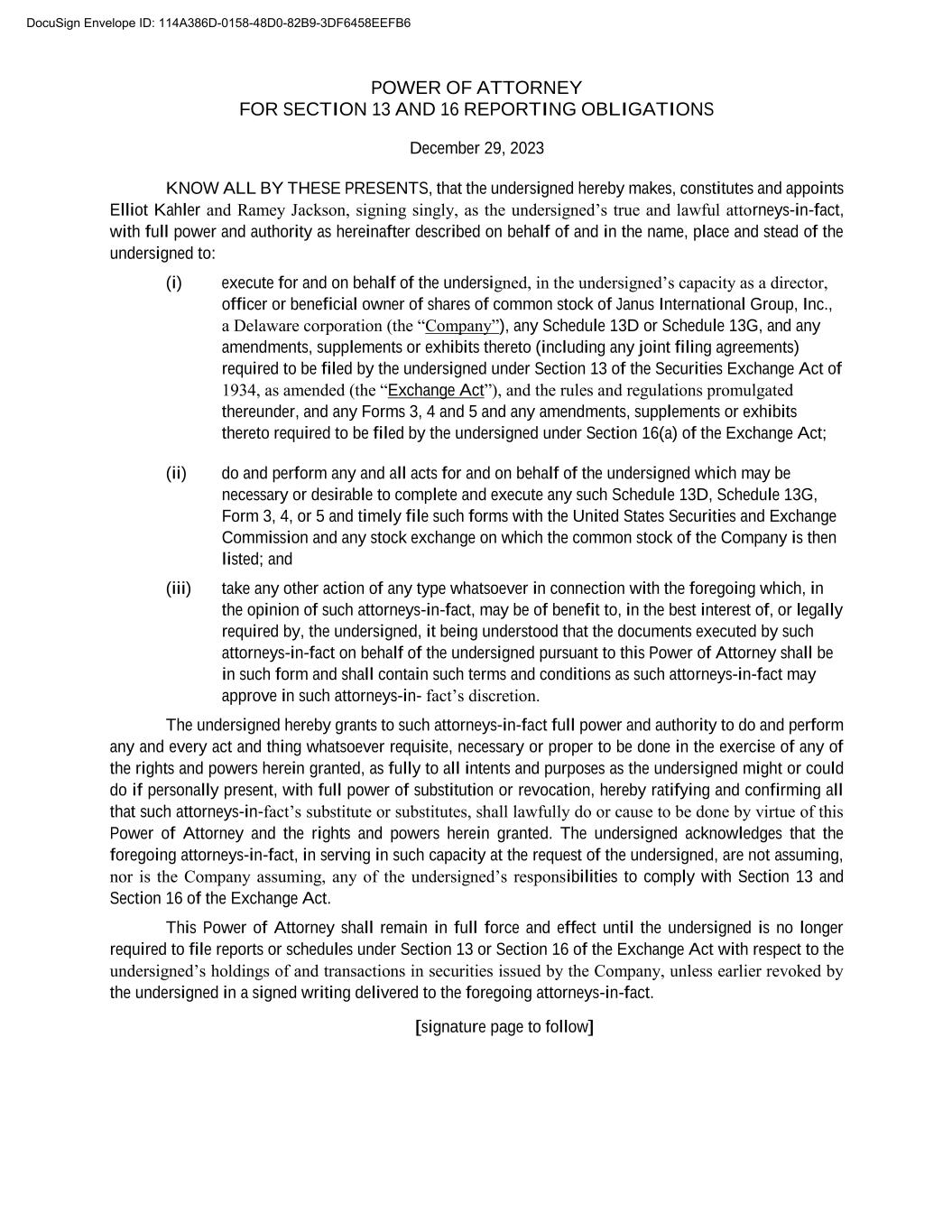 POWER OF ATTORNEY FOR SECTION 13 AND 16 REPORTING OBLIGATIONS December 29, 2023 KNOW ALL BY THESE PRESENTS, that the undersigned hereby makes, constitutes and appoints Elliot Kahler and Ramey Jackson, signing singly, as the undersigned’s true and lawful attorneys-in-fact, with full power and authority as hereinafter described on behalf of and in the name, place and stead of the undersigned to: (i) execute for and on behalf of the undersigned, in the undersigned’s capacity as a director, officer or beneficial owner of shares of common stock of Janus International Group, Inc., a Delaware corporation (the “Company”), any Schedule 13D or Schedule 13G, and any amendments, supplements or exhibits thereto (including any joint filing agreements) required to be filed by the undersigned under Section 13 of the Securities Exchange Act of 1934, as amended (the “Exchange Act”), and the rules and regulations promulgated thereunder, and any Forms 3, 4 and 5 and any amendments, supplements or exhibits thereto required to be filed by the undersigned under Section 16(a) of the Exchange Act; (ii) do and perform any and all acts for and on behalf of the undersigned which may be necessary or desirable to complete and execute any such Schedule 13D, Schedule 13G, Form 3, 4, or 5 and timely file such forms with the United States Securities and Exchange Commission and any stock exchange on which the common stock of the Company is then listed; and (iii) take any other action of any type whatsoever in connection with the foregoing which, in the opinion of such attorneys-in-fact, may be of benefit to, in the best interest of, or legally required by, the undersigned, it being understood that the documents executed by such attorneys-in-fact on behalf of the undersigned pursuant to this Power of Attorney shall be in such form and shall contain such terms and conditions as such attorneys-in-fact may approve in such attorneys-in- fact’s discretion. The undersigned hereby grants to such attorneys-in-fact full power and authority to do and perform any and every act and thing whatsoever requisite, necessary or proper to be done in the exercise of any of the rights and powers herein granted, as fully to all intents and purposes as the undersigned might or could do if personally present, with full power of substitution or revocation, hereby ratifying and confirming all that such attorneys-in-fact’s substitute or substitutes, shall lawfully do or cause to be done by virtue of this Power of Attorney and the rights and powers herein granted. The undersigned acknowledges that the foregoing attorneys-in-fact, in serving in such capacity at the request of the undersigned, are not assuming, nor is the Company assuming, any of the undersigned’s responsibilities to comply with Section 13 and Section 16 of the Exchange Act. This Power of Attorney shall remain in full force and effect until the undersigned is no longer required to file reports or schedules under Section 13 or Section 16 of the Exchange Act with respect to the undersigned’s holdings of and transactions in securities issued by the Company, unless earlier revoked by the undersigned in a signed writing delivered to the foregoing attorneys-in-fact. [signature page to follow] DocuSign Envelope ID: 114A386D-0158-48D0-82B9-3DF6458EEFB6
