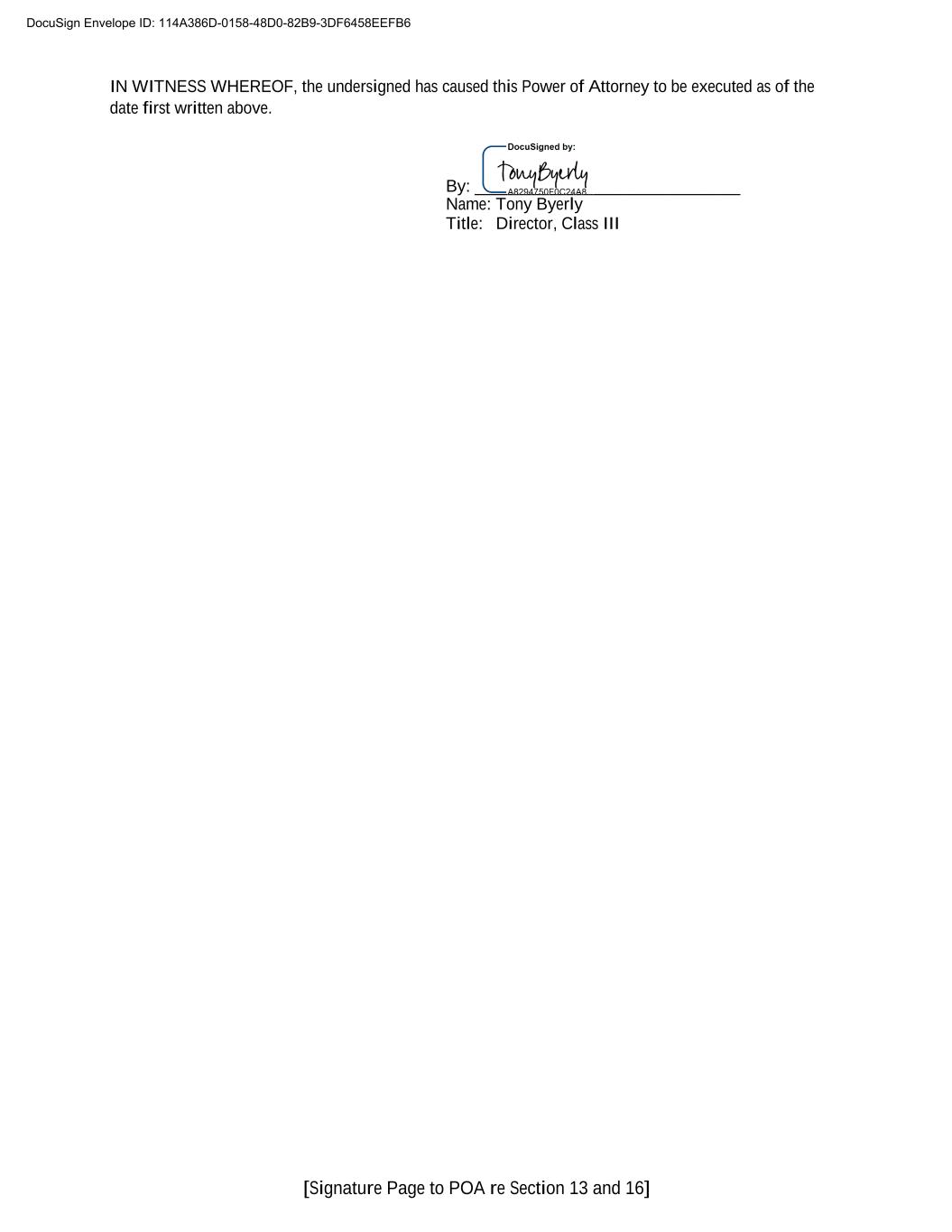 [Signature Page to POA re Section 13 and 16] IN WITNESS WHEREOF, the undersigned has caused this Power of Attorney to be executed as of the date first written above. By: _______________________________ Name: Tony Byerly Title: Director, Class III DocuSign Envelope ID: 114A386D-0158-48D0-82B9-3DF6458EEFB6