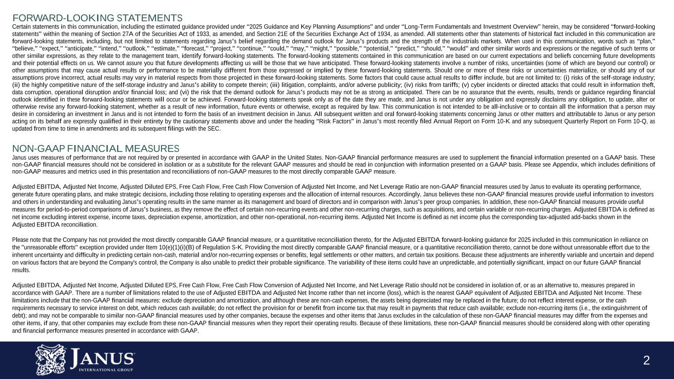 2 FORWARD-LOOKING STATEMENTS Certain statements in this communication, including the estimated guidance provided under “2025 Guidance and Key Planning Assumptions” and under “Long-Term Fundamentals and Investment Overview” herein, may be considered “forward-looking statements” within the meaning of Section 27A of the Securities Act of 1933, as amended, and Section 21E of the Securities Exchange Act of 1934, as amended. All statements other than statements of historical fact included in this communication are forward-looking statements, including, but not limited to statements regarding Janus’s belief regarding the demand outlook for Janus’s products and the strength of the industrials markets. When used in this communication, words such as “plan,” “believe,” “expect,” “anticipate,” “intend,” “outlook,” “estimate,” “forecast,” “project,” “continue,” “could,” “may,” “might,” “possible,” “potential,” “predict,” “should,” “would” and other similar words and expressions or the negative of such terms or other similar expressions, as they relate to the management team, identify forward-looking statements. The forward-looking statements contained in this communication are based on our current expectations and beliefs concerning future developments and their potential effects on us. We cannot assure you that future developments affecting us will be those that we have anticipated. These forward-looking statements involve a number of risks, uncertainties (some of which are beyond our control) or other assumptions that may cause actual results or performance to be materially different from those expressed or implied by these forward-looking statements. Should one or more of these risks or uncertainties materialize, or should any of our assumptions prove incorrect, actual results may vary in material respects from those projected in these forward-looking statements. Some factors that could cause actual results to differ include, but are not limited to: (i) risks of the self-storage industry; (ii) the highly competitive nature of the self-storage industry and Janus’s ability to compete therein; (iii) litigation, complaints, and/or adverse publicity; (iv) risks from tariffs; (v) cyber incidents or directed attacks that could result in information theft, data corruption, operational disruption and/or financial loss; and (vi) the risk that the demand outlook for Janus’s products may not be as strong as anticipated. There can be no assurance that the events, results, trends or guidance regarding financial outlook identified in these forward-looking statements will occur or be achieved. Forward-looking statements speak only as of the date they are made, and Janus is not under any obligation and expressly disclaims any obligation, to update, alter or otherwise revise any forward-looking statement, whether as a result of new information, future events or otherwise, except as required by law. This communication is not intended to be all-inclusive or to contain all the information that a person may desire in considering an investment in Janus and is not intended to form the basis of an investment decision in Janus. All subsequent written and oral forward-looking statements concerning Janus or other matters and attributable to Janus or any person acting on its behalf are expressly qualified in their entirety by the cautionary statements above and under the heading “Risk Factors” in Janus’s most recently filed Annual Report on Form 10-K and any subsequent Quarterly Report on Form 10-Q, as updated from time to time in amendments and its subsequent filings with the SEC. NON-GAAP FINANCIAL MEASURES Janus uses measures of performance that are not required by or presented in accordance with GAAP in the United States. Non-GAAP financial performance measures are used to supplement the financial information presented on a GAAP basis. These non-GAAP financial measures should not be considered in isolation or as a substitute for the relevant GAAP measures and should be read in conjunction with information presented on a GAAP basis. Please see Appendix, which includes definitions of non-GAAP measures and metrics used in this presentation and reconciliations of non-GAAP measures to the most directly comparable GAAP measure. Adjusted EBITDA, Adjusted Net Income, Adjusted Diluted EPS, Free Cash Flow, Free Cash Flow Conversion of Adjusted Net Income, and Net Leverage Ratio are non-GAAP financial measures used by Janus to evaluate its operating performance, generate future operating plans, and make strategic decisions, including those relating to operating expenses and the allocation of internal resources. Accordingly, Janus believes these non-GAAP financial measures provide useful information to investors and others in understanding and evaluating Janus’s operating results in the same manner as its management and board of directors and in comparison with Janus’s peer group companies. In addition, these non-GAAP financial measures provide useful measures for period-to-period comparisons of Janus’s business, as they remove the effect of certain non-recurring events and other non-recurring charges, such as acquisitions, and certain variable or non-recurring charges. Adjusted EBITDA is defined as net income excluding interest expense, income taxes, depreciation expense, amortization, and other non-operational, non-recurring items. Adjusted Net Income is defined as net income plus the corresponding tax-adjusted add-backs shown in the Adjusted EBITDA reconciliation. Please note that the Company has not provided the most directly comparable GAAP financial measure, or a quantitative reconciliation thereto, for the Adjusted EBITDA forward-looking guidance for 2025 included in this communication in reliance on the "unreasonable efforts" exception provided under Item 10(e)(1)(i)(B) of Regulation S-K. Providing the most directly compara