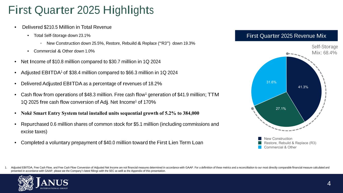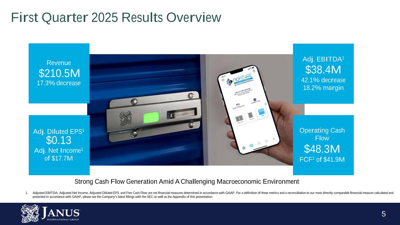 4 • Delivered $210.5 Million in Total Revenue • Total Self-Storage down 23.1% ◦ New Construction down 25.5%, Restore, Rebuild & Replace (“R3”) down 19.3% • Commercial & Other down 1.0% • Net Income of $10.8 million compared to $30.7 million in 1Q 2024 • Adjusted EBITDA1 of $38.4 million compared to $66.3 million in 1Q 2024 • Delivered Adjusted EBITDA as a percentage of revenues of 18.2% • Cash flow from operations of $48.3 million. Free cash flow1 generation of $41.9 million; TTM 1Q 2025 free cash flow conversion of Adj. Net Income1 of 170% • Nokē Smart Entry System total installed units sequential growth of 5.2% to 384,000 • Repurchased 0.6 million shares of common stock for $5.1 million (including commissions and excise taxes) • Completed a voluntary prepayment of $40.0 million toward the First Lien Term Loan First Quarter 2025 Revenue Mix First Quarter 2025 Highlights 1. Adjusted EBITDA, Free Cash Flow, and Free Cash Flow Conversion of Adjusted Net Income are not financial measures determined in accordance with GAAP. For a definition of these metrics and a reconciliation to our most directly comparable financial measure calculated and presented in accordance with GAAP, please see the Company’s latest filings with the SEC as well as the Appendix of this presentation. Self-Storage Mix: 68.4%