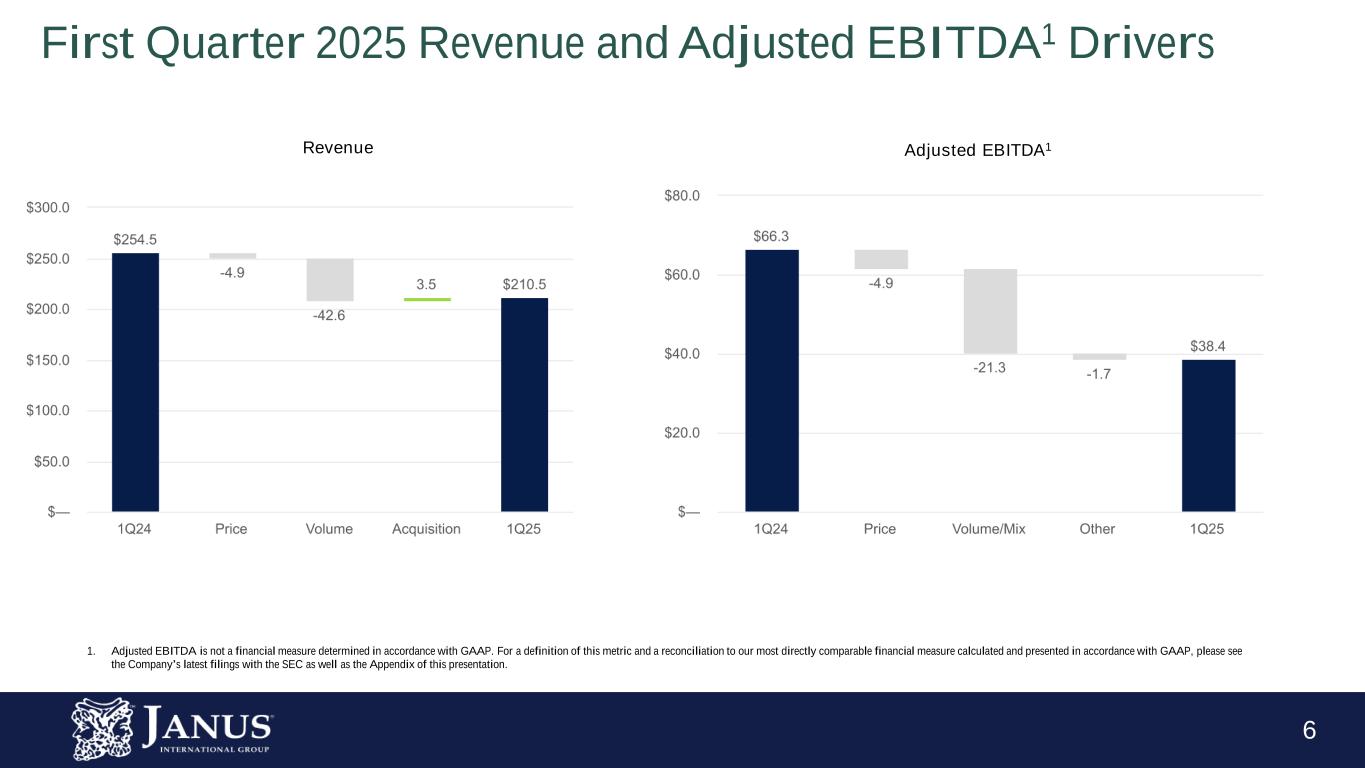 5 1. Adjusted EBITDA, Adjusted Net Income, Adjusted Diluted EPS, and Free Cash Flow are not financial measures determined in accordance with GAAP. For a definition of these metrics and a reconciliation to our most directly comparable financial measure calculated and presented in accordance with GAAP, please see the Company’s latest filings with the SEC as well as the Appendix of this presentation. Adj. EBITDA1 $38.4M 42.1% decrease 18.2% margin Revenue $210.5M 17.3% decrease Adj. Diluted EPS1 $0.13 Adj. Net Income1 of $17.7M Operating Cash Flow $48.3M FCF1 of $41.9M First Quarter 2025 Results Overview Strong Cash Flow Generation Amid A Challenging Macroeconomic Environment