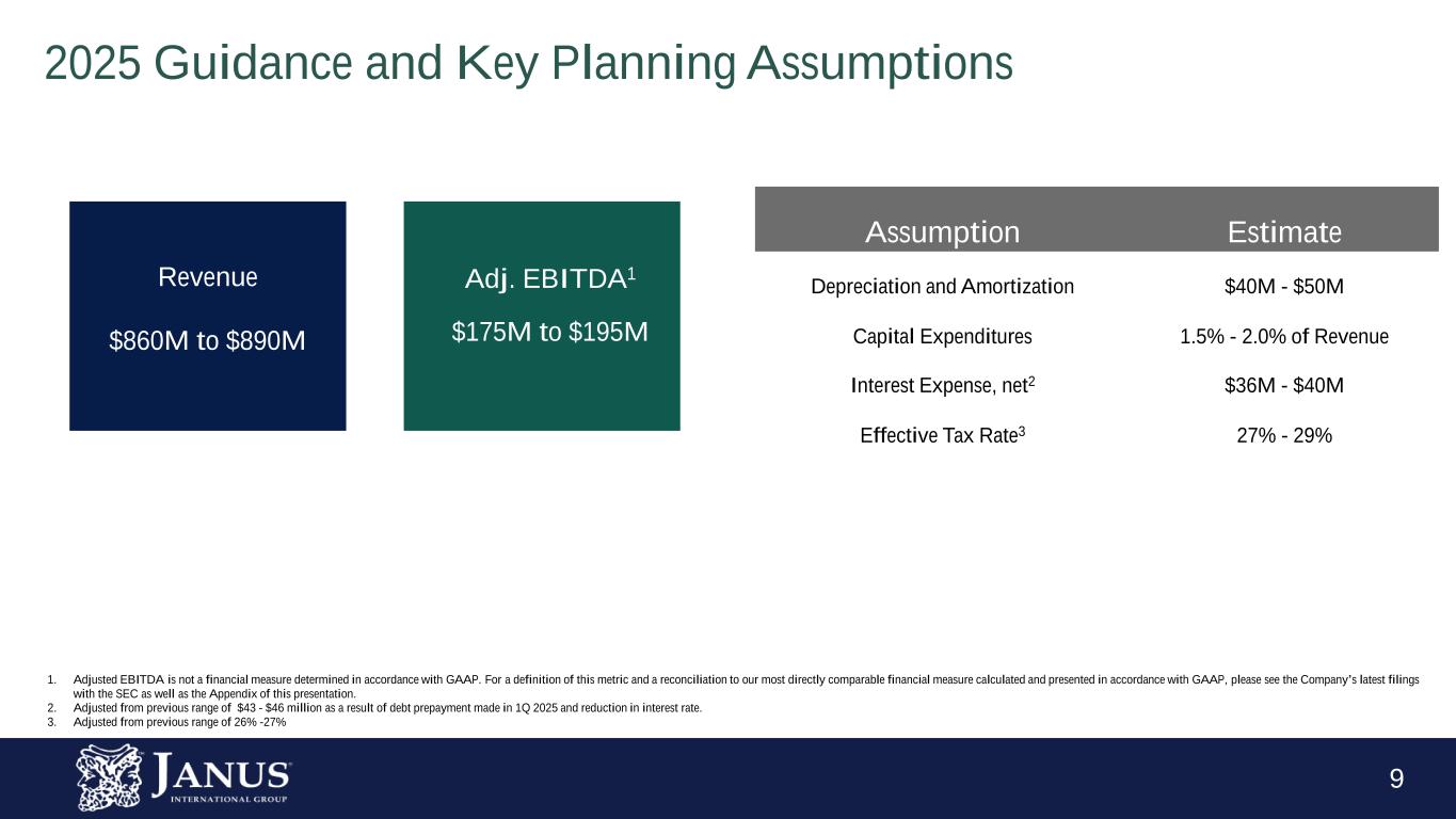 8 Building on Record of High Return Capital Allocation Strong cash flow profile, financial flexibility, disciplined capital deployment Free Cash Flow Conversion of Adj. Net Income1 170% TTM as of 1Q 2025 Solid Balance Sheet 2.0x-3.0x Net Leverage Ratio Target1 Net Debt/TTM Adj. EBITDA of 2.3x as of 1Q 2025 Liquidity2 of $217.1M as of 1Q 2025 Invest in Growth Acquisitions Focus on core business and strategic adjacencies Aim to maintain discipline across all capital allocation opportunities Financial Flexibility Share Repurchases And other actions intended to optimize capital structure and returns 1Q 2025 Repurchased 0.6M shares for $5.1M (including commissions and excise taxes) 1. Free Cash Flow Conversion of Adjusted Net Income and Net Leverage Ratio are not financial measures determined in accordance with GAAP. For a definition of these metrics and reconciliation to our most directly comparable financial measure calculated and presented in accordance with GAAP, please see the Company’s latest filings with the SEC as well as the Appendix of this presentation. 2. Liquidity is defined as cash and cash equivalents + available balance on line of credit.