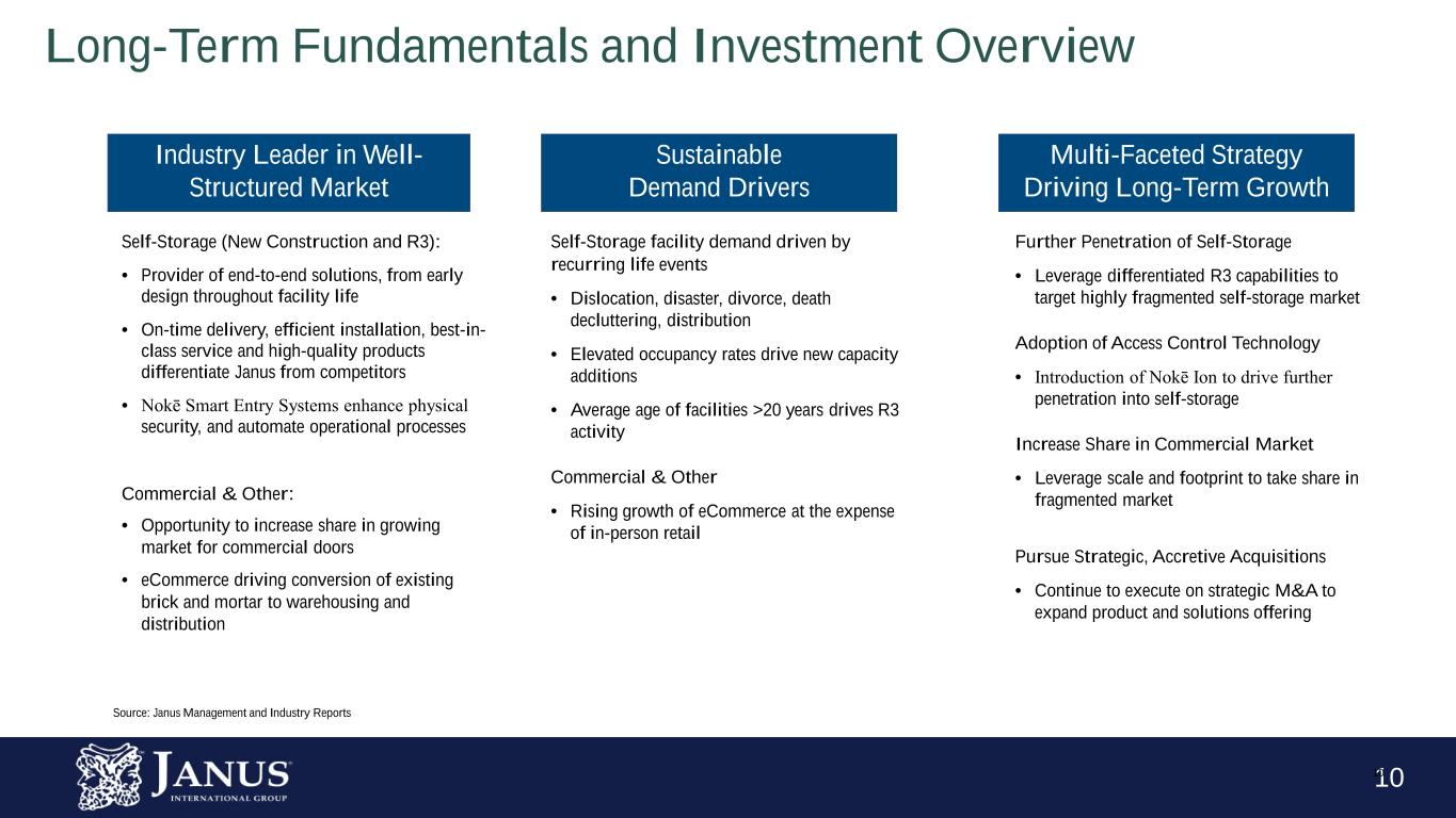 1010 Industry Leader in Well- Structured Market Sustainable Demand Drivers Self-Storage facility demand driven by recurring life events • Dislocation, disaster, divorce, death decluttering, distribution • Elevated occupancy rates drive new capacity additions • Average age of facilities >20 years drives R3 activity Commercial & Other • Rising growth of eCommerce at the expense of in-person retail Self-Storage (New Construction and R3): • Provider of end-to-end solutions, from early design throughout facility life • On-time delivery, efficient installation, best-in- class service and high-quality products differentiate Janus from competitors • Nokē Smart Entry Systems enhance physical security, and automate operational processes Commercial & Other: • Opportunity to increase share in growing market for commercial doors • eCommerce driving conversion of existing brick and mortar to warehousing and distribution Long-Term Fundamentals and Investment Overview Multi-Faceted Strategy Driving Long-Term Growth Further Penetration of Self-Storage • Leverage differentiated R3 capabilities to target highly fragmented self-storage market Adoption of Access Control Technology • Introduction of Nokē Ion to drive further penetration into self-storage Increase Share in Commercial Market • Leverage scale and footprint to take share in fragmented market Pursue Strategic, Accretive Acquisitions • Continue to execute on strategic M&A to expand product and solutions offering Source: Janus Management and Industry Reports
