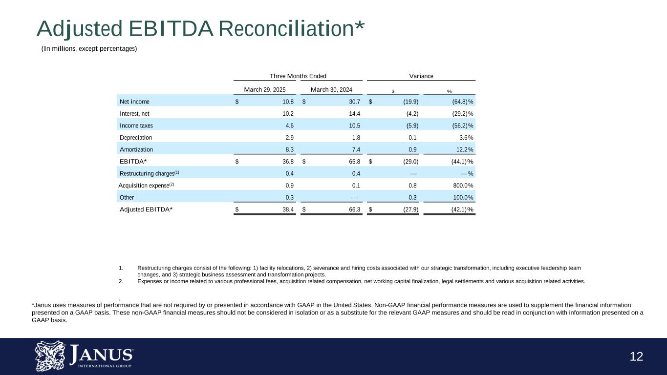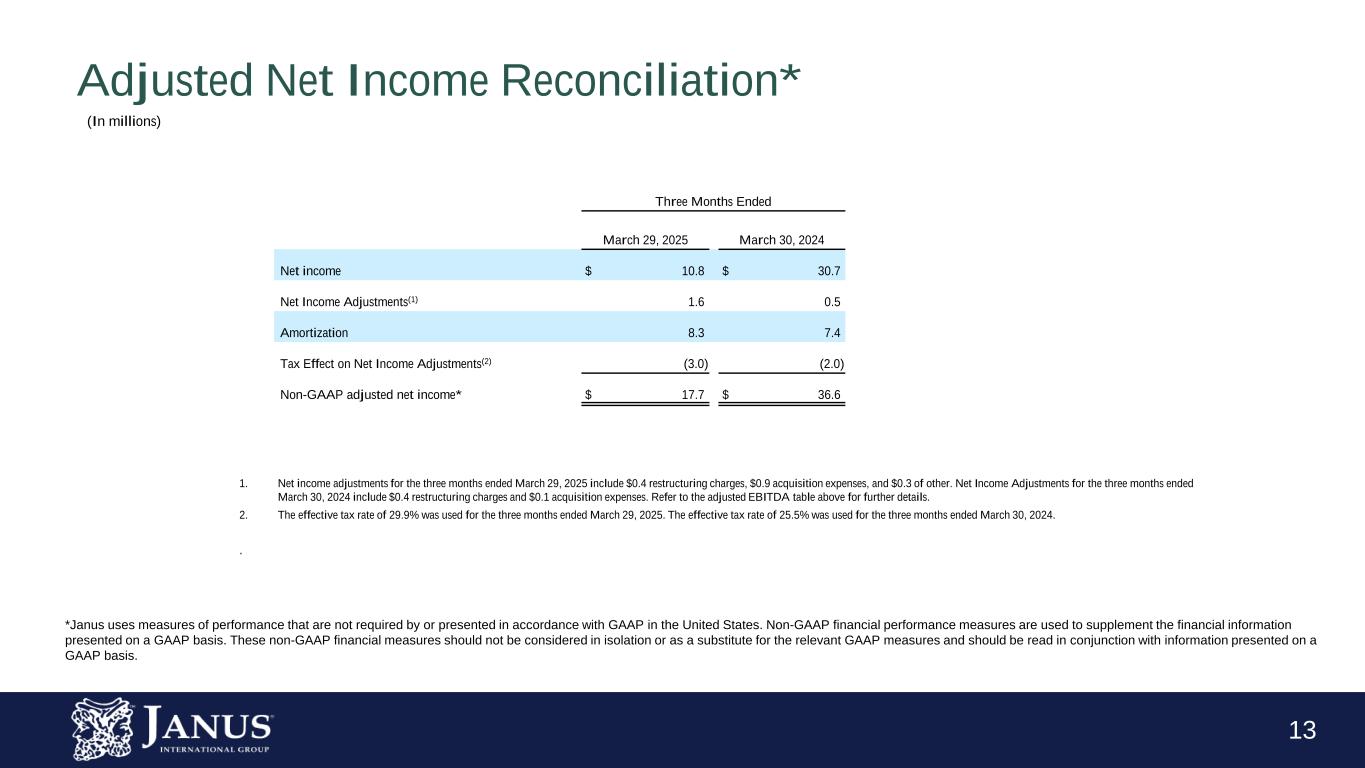 12 Adjusted EBITDA Reconciliation* Three Months Ended Variance March 29, 2025 March 30, 2024 $ % Net income $ 10.8 $ 30.7 $ (19.9) (64.8)% Interest, net 10.2 14.4 (4.2) (29.2)% Income taxes 4.6 10.5 (5.9) (56.2)% Depreciation 2.9 1.8 0.1 3.6% Amortization 8.3 7.4 0.9 12.2% EBITDA* $ 36.8 $ 65.8 $ (29.0) (44.1)% Restructuring charges(1) 0.4 0.4 — — % Acquisition expense(2) 0.9 0.1 0.8 800.0% Other 0.3 — 0.3 100.0% Adjusted EBITDA* $ 38.4 $ 66.3 $ (27.9) (42.1)% 1. Restructuring charges consist of the following: 1) facility relocations, 2) severance and hiring costs associated with our strategic transformation, including executive leadership team changes, and 3) strategic business assessment and transformation projects. 2. Expenses or income related to various professional fees, acquisition related compensation, net working capital finalization, legal settlements and various acquisition related activities. . *Janus uses measures of performance that are not required by or presented in accordance with GAAP in the United States. Non-GAAP financial performance measures are used to supplement the financial information presented on a GAAP basis. These non-GAAP financial measures should not be considered in isolation or as a substitute for the relevant GAAP measures and should be read in conjunction with information presented on a GAAP basis. (In millions, except percentages)