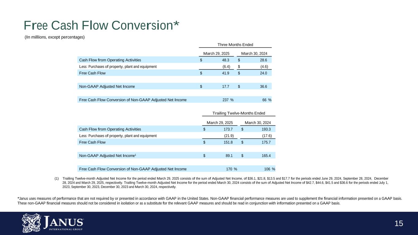 14 Non-GAAP Adjusted EPS* Three Months Ended March 29, 2025 March 30, 2024 Numerator: GAAP Net Income $ 10.8 $ 30.7 Non-GAAP Adjusted Net Income $ 17.7 $ 36.6 Denominator: Weighted average number of shares: Basic 140,050,632 146,604,142 Adjustment for Dilutive Securities 219,862 442,070 Diluted 140,270,494 147,046,212 GAAP Basic EPS $ 0.08 $ 0.21 GAAP Diluted EPS $ 0.08 $ 0.21 Non-GAAP Adjusted Basic EPS $ 0.13 $ 0.25 Non-GAAP Adjusted Diluted EPS $ 0.13 $ 0.25 *Janus uses measures of performance that are not required by or presented in accordance with GAAP in the United States. Non-GAAP financial performance measures are used to supplement the financial information presented on a GAAP basis. These non-GAAP financial measures should not be considered in isolation or as a substitute for the relevant GAAP measures and should be read in conjunction with information presented on a GAAP basis. (In millions, except per share data)