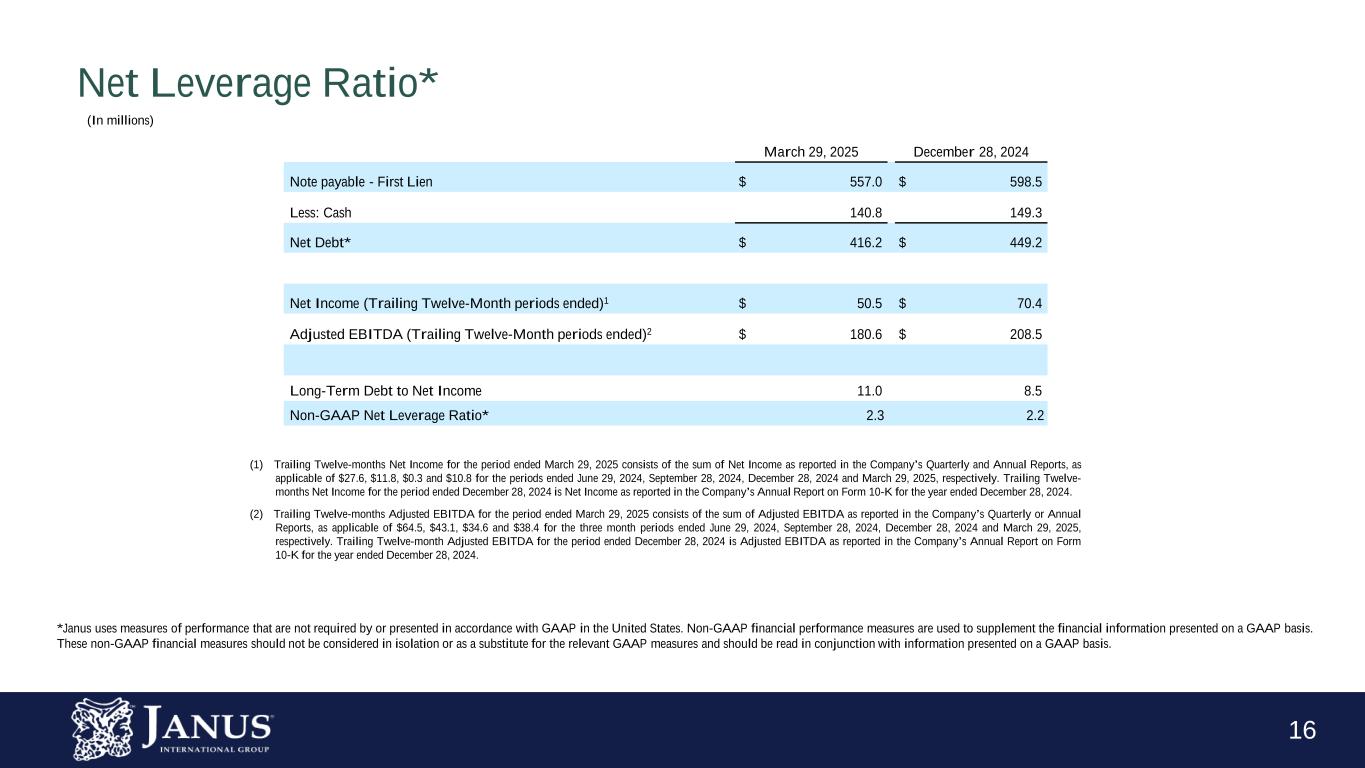 15 Free Cash Flow Conversion* Trailing Twelve-Months Ended March 29, 2025 March 30, 2024 Cash Flow from Operating Activities $ 173.7 $ 193.3 Less: Purchases of property, plant and equipment (21.9) (17.6) Free Cash Flow $ 151.8 $ 175.7 Non-GAAP Adjusted Net Income1 $ 89.1 $ 165.4 Free Cash Flow Conversion of Non-GAAP Adjusted Net Income 170 % 106 % Three Months Ended March 29, 2025 March 30, 2024 Cash Flow from Operating Activities $ 48.3 $ 28.6 Less: Purchases of property, plant and equipment (6.4) $ (4.6) Free Cash Flow $ 41.9 $ 24.0 Non-GAAP Adjusted Net Income $ 17.7 $ 36.6 Free Cash Flow Conversion of Non-GAAP Adjusted Net Income 237 % 66 % *Janus uses measures of performance that are not required by or presented in accordance with GAAP in the United States. Non-GAAP financial performance measures are used to supplement the financial information presented on a GAAP basis. These non-GAAP financial measures should not be considered in isolation or as a substitute for the relevant GAAP measures and should be read in conjunction with information presented on a GAAP basis. (1) Trailing Twelve-month Adjusted Net Income for the period ended March 29, 2025 consists of the sum of Adjusted Net Income, of $36.1, $21.8, $13.5 and $17.7 for the periods ended June 29, 2024, September 28, 2024, December 28, 2024 and March 29, 2025, respectively. Trailing Twelve-month Adjusted Net Income for the period ended March 30, 2024 consists of the sum of Adjusted Net Income of $42.7, $44.6, $41.5 and $36.6 for the periods ended July 1, 2023, September 30, 2023, December 30, 2023 and March 30, 2024, respectively. (In millions, except percentages)