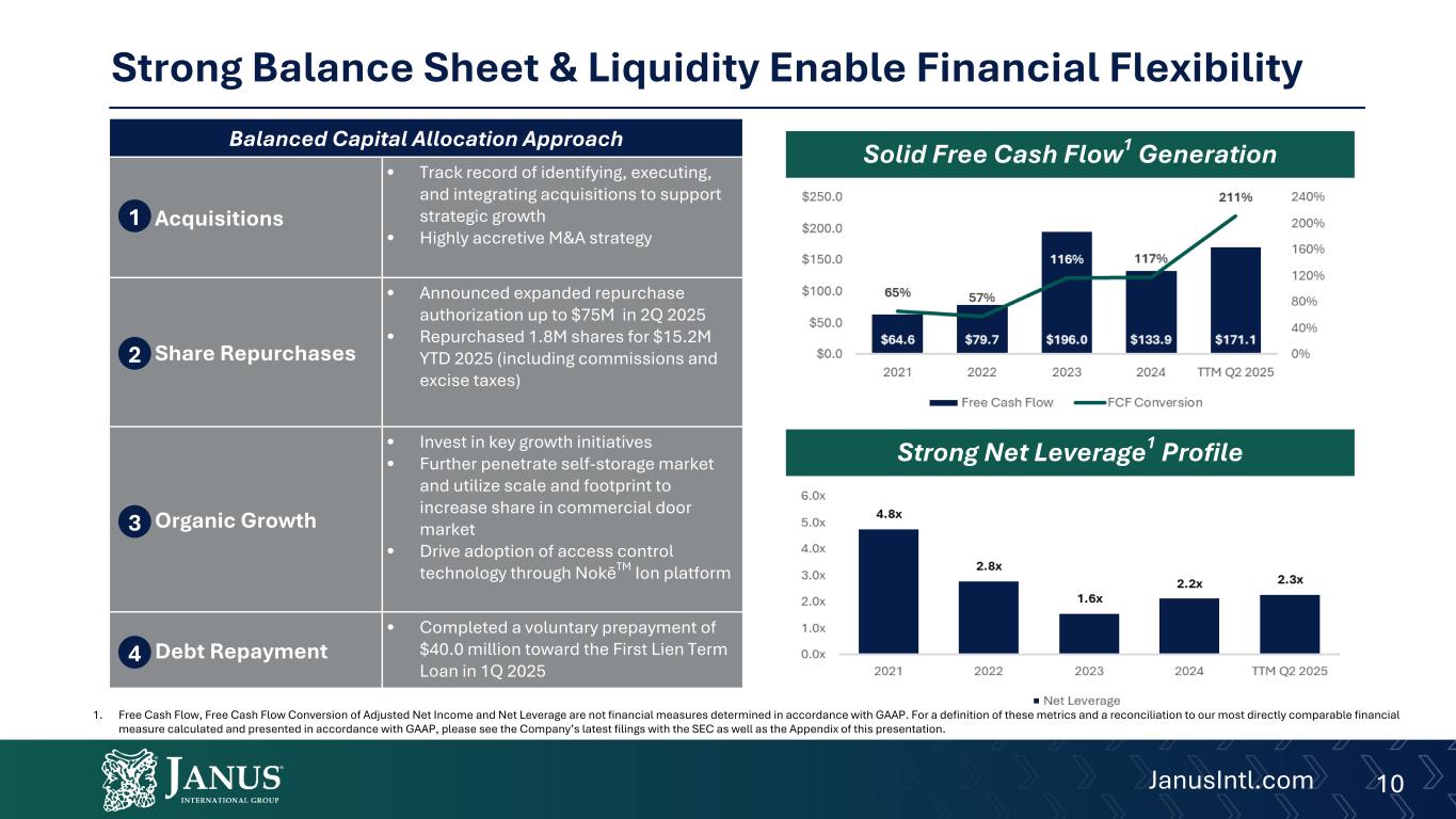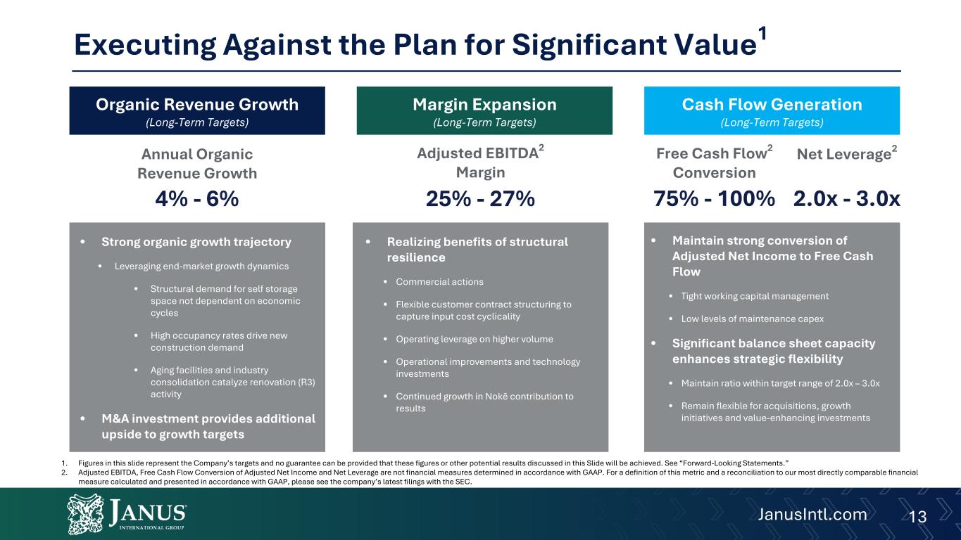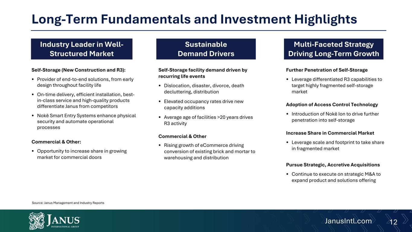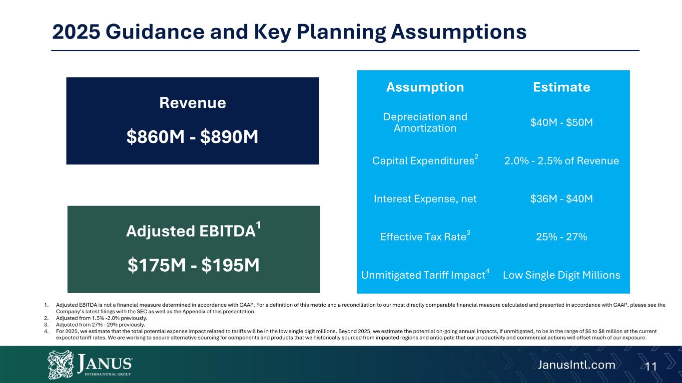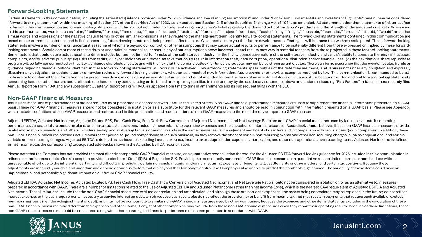 2JanusIntl.com Forward-Looking Statements Certain statements in this communication, including the estimated guidance provided under “2025 Guidance and Key Planning Assumptions” and under “Long-Term Fundamentals and Investment Highlights” herein, may be considered “forward-looking statements” within the meaning of Section 27A of the Securities Act of 1933, as amended, and Section 21E of the Securities Exchange Act of 1934, as amended. All statements other than statements of historical fact included in this communication are forward-looking statements, including, but not limited to statements regarding Janus’s belief regarding the demand outlook for Janus’s products and the strength of the industrials markets. When used in this communication, words such as “plan,” “believe,” “expect,” “anticipate,” “intend,” “outlook,” “estimate,” “forecast,” “project,” “continue,” “could,” “may,” “might,” “possible,” “potential,” “predict,” “should,” “would” and other similar words and expressions or the negative of such terms or other similar expressions, as they relate to the management team, identify forward-looking statements. The forward-looking statements contained in this communication are based on our current expectations and beliefs concerning future developments and their potential effects on us. We cannot assure you that future developments affecting us will be those that we have anticipated. These forward-looking statements involve a number of risks, uncertainties (some of which are beyond our control) or other assumptions that may cause actual results or performance to be materially different from those expressed or implied by these forward- looking statements. Should one or more of these risks or uncertainties materialize, or should any of our assumptions prove incorrect, actual results may vary in material respects from those projected in these forward-looking statements. Some factors that could cause actual results to differ include, but are not limited to: (i) risks of the self-storage industry; (ii) the highly competitive nature of the self-storage industry and Janus’s ability to compete therein; (iii) litigation, complaints, and/or adverse publicity; (iv) risks from tariffs; (v) cyber incidents or directed attacks that could result in information theft, data corruption, operational disruption and/or financial loss; (vi) the risk that our share repurchase program will be fully consummated or that it will enhance shareholder value; and (vii) the risk that the demand outlook for Janus’s products may not be as strong as anticipated. There can be no assurance that the events, results, trends or guidance regarding financial outlook identified in these forward-looking statements will occur or be achieved. Forward-looking statements speak only as of the date they are made, and Janus is not under any obligation and expressly disclaims any obligation, to update, alter or otherwise revise any forward-looking statement, whether as a result of new information, future events or otherwise, except as required by law. This communication is not intended to be all- inclusive or to contain all the information that a person may desire in considering an investment in Janus and is not intended to form the basis of an investment decision in Janus. All subsequent written and oral forward-looking statements concerning Janus or other matters and attributable to Janus or any person acting on its behalf are expressly qualified in their entirety by the cautionary statements above and under the heading “Risk Factors” in Janus’s most recently filed Annual Report on Form 10-K and any subsequent Quarterly Report on Form 10-Q, as updated from time to time in amendments and its subsequent filings with the SEC. Non-GAAP Financial Measures Janus uses measures of performance that are not required by or presented in accordance with GAAP in the United States. Non-GAAP financial performance measures are used to supplement the financial information presented on a GAAP basis. These non-GAAP financial measures should not be considered in isolation or as a substitute for the relevant GAAP measures and should be read in conjunction with information presented on a GAAP basis. Please see Appendix, which includes definitions of non-GAAP measures and metrics used in this presentation and reconciliations of non-GAAP measures to the most directly comparable GAAP measure. Adjusted EBITDA, Adjusted Net Income, Adjusted Diluted EPS, Free Cash Flow, Free Cash Flow Conversion of Adjusted Net Income, and Net Leverage Ratio are non-GAAP financial measures used by Janus to evaluate its operating performance, generate future operating plans, and make strategic decisions, including those relating to operating expenses and the allocation of internal resources. Accordingly, Janus believes these non-GAAP financial measures provide useful information to investors and others in understanding and evaluating Janus’s operating results in the same manner as its management and board of directors and in comparison with Janus’s peer group companies. In addition, these non-GAAP financial measures provide useful measures for period-to-period comparisons of Janus’s business, as they remove the effect of certain non-recurring events and other non-recurring charges, such as acquisitions, and certain variable or non-recurring charges. Adjusted EBITDA is defined as net income excluding interest expense, income taxes, depreciation expense, amortization, and other non-operational, non-recurring items. Adjusted Net Income is defined as net income plus the corresponding tax-adjusted add-backs shown in the Adjusted EBITDA reconciliation. Please note that the Company has not provided the most directly comparable GAAP financial measure, or a quantitative reconciliation thereto, for the Adjusted EBITDA forward-looking guidance for 2025 included in this communication in rel