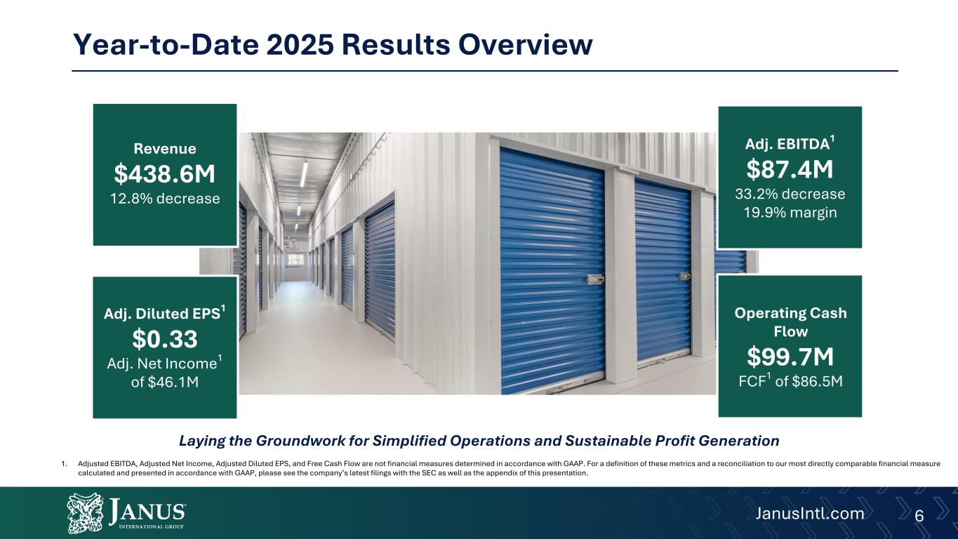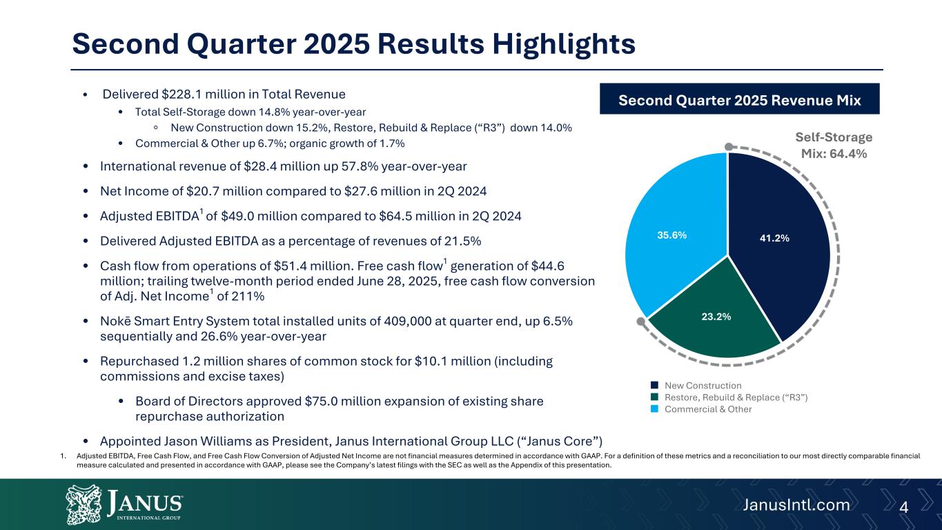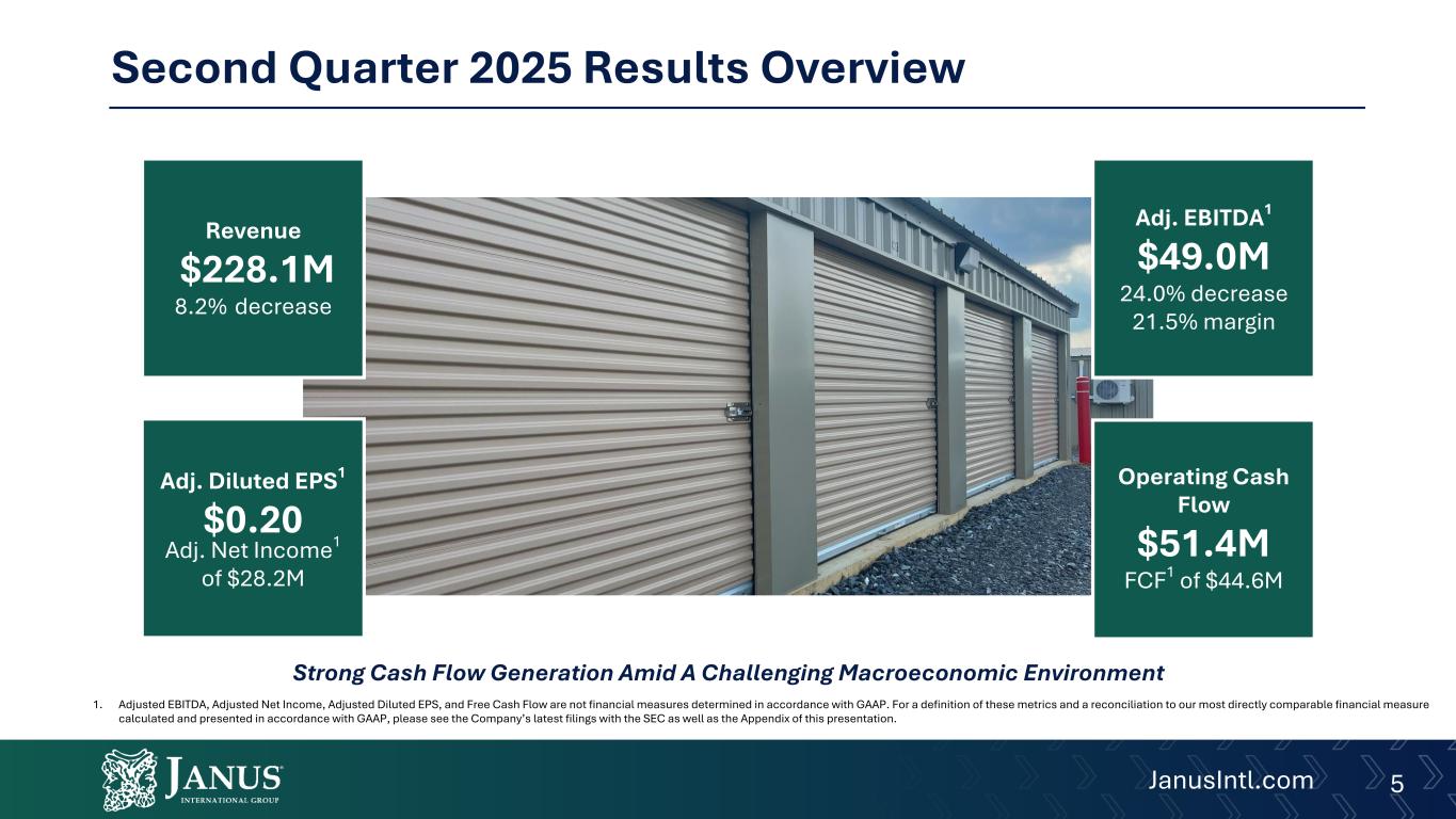 4JanusIntl.com Second Quarter 2025 Results Highlights • Delivered $228.1 million in Total Revenue • Total Self-Storage down 14.8% year-over-year ◦ New Construction down 15.2%, Restore, Rebuild & Replace (“R3”) down 14.0% • Commercial & Other up 6.7%; organic growth of 1.7% • International revenue of $28.4 million up 57.8% year-over-year • Net Income of $20.7 million compared to $27.6 million in 2Q 2024 • Adjusted EBITDA1 of $49.0 million compared to $64.5 million in 2Q 2024 • Delivered Adjusted EBITDA as a percentage of revenues of 21.5% • Cash flow from operations of $51.4 million. Free cash flow1 generation of $44.6 million; trailing twelve-month period ended June 28, 2025, free cash flow conversion of Adj. Net Income1 of 211% • Nokē Smart Entry System total installed units of 409,000 at quarter end, up 6.5% sequentially and 26.6% year-over-year • Repurchased 1.2 million shares of common stock for $10.1 million (including commissions and excise taxes) • Board of Directors approved $75.0 million expansion of existing share repurchase authorization • Appointed Jason Williams as President, Janus International Group LLC (“Janus Core”) Second Quarter 2025 Revenue Mix Self-Storage Mix: 64.4% 1. Adjusted EBITDA, Free Cash Flow, and Free Cash Flow Conversion of Adjusted Net Income are not financial measures determined in accordance with GAAP. For a definition of these metrics and a reconciliation to our most directly comparable financial measure calculated and presented in accordance with GAAP, please see the Company’s latest filings with the SEC as well as the Appendix of this presentation. 41.2% 23.2% 35.6% New Construction Restore, Rebuild & Replace (“R3”) Commercial & Other