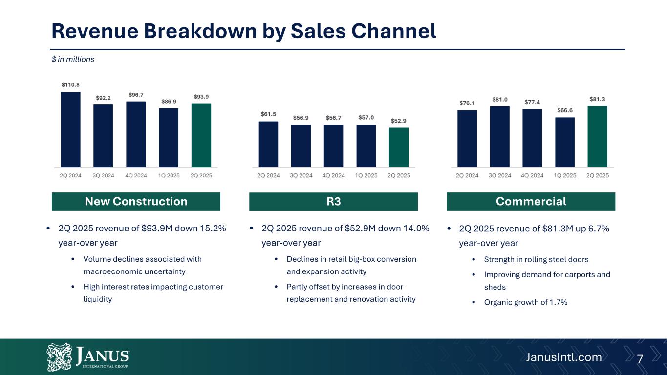 6JanusIntl.com Year-to-Date 2025 Results Overview Adj. EBITDA1 $87.4M 33.2% decrease 19.9% margin Revenue $438.6M 12.8% decrease Adj. Diluted EPS1 $0.33 Adj. Net Income1 of $46.1M Operating Cash Flow $99.7M FCF1 of $86.5M 1. Adjusted EBITDA, Adjusted Net Income, Adjusted Diluted EPS, and Free Cash Flow are not financial measures determined in accordance with GAAP. For a definition of these metrics and a reconciliation to our most directly comparable financial measure calculated and presented in accordance with GAAP, please see the company’s latest filings with the SEC as well as the appendix of this presentation. Laying the Groundwork for Simplified Operations and Sustainable Profit Generation