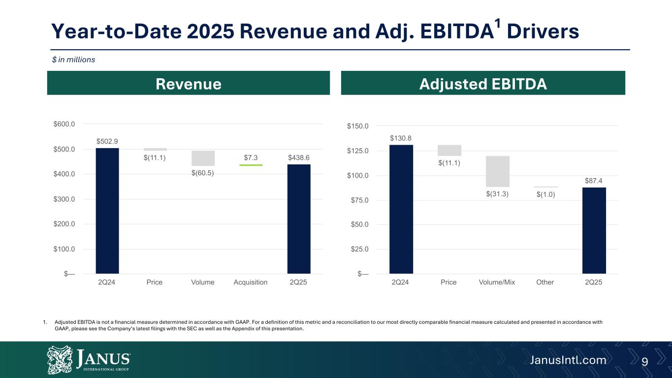 8JanusIntl.com Second Quarter 2025 Revenue and Adj. EBITDA1 Drivers Revenue Adjusted EBITDA 1. Adjusted EBITDA is not a financial measure determined in accordance with GAAP. For a definition of this metric and a reconciliation to our most directly comparable financial measure calculated and presented in accordance with GAAP, please see the Company’s latest filings with the SEC as well as the Appendix of this presentation. $ in millions $248.4 $(6.2) $(17.9) $3.8 $228.1 2Q24 Price Volume Acquisition 2Q25 $— $50.0 $100.0 $150.0 $200.0 $250.0 $300.0 $64.5 $(6.2) $(10.0) $0.7 $49.0 2Q24 Price Volume/Mix Other 2Q25 $— $20.0 $40.0 $60.0 $80.0