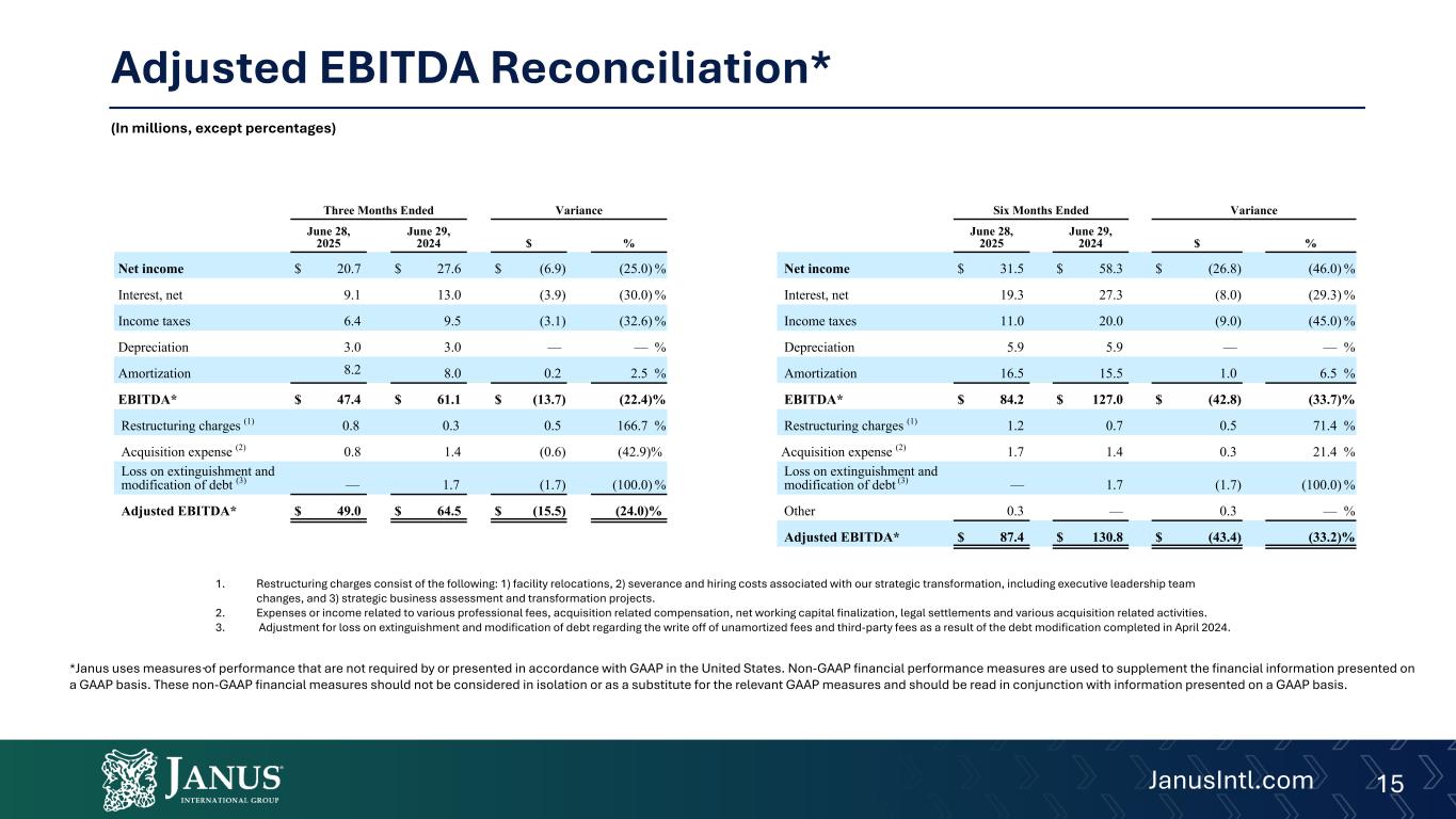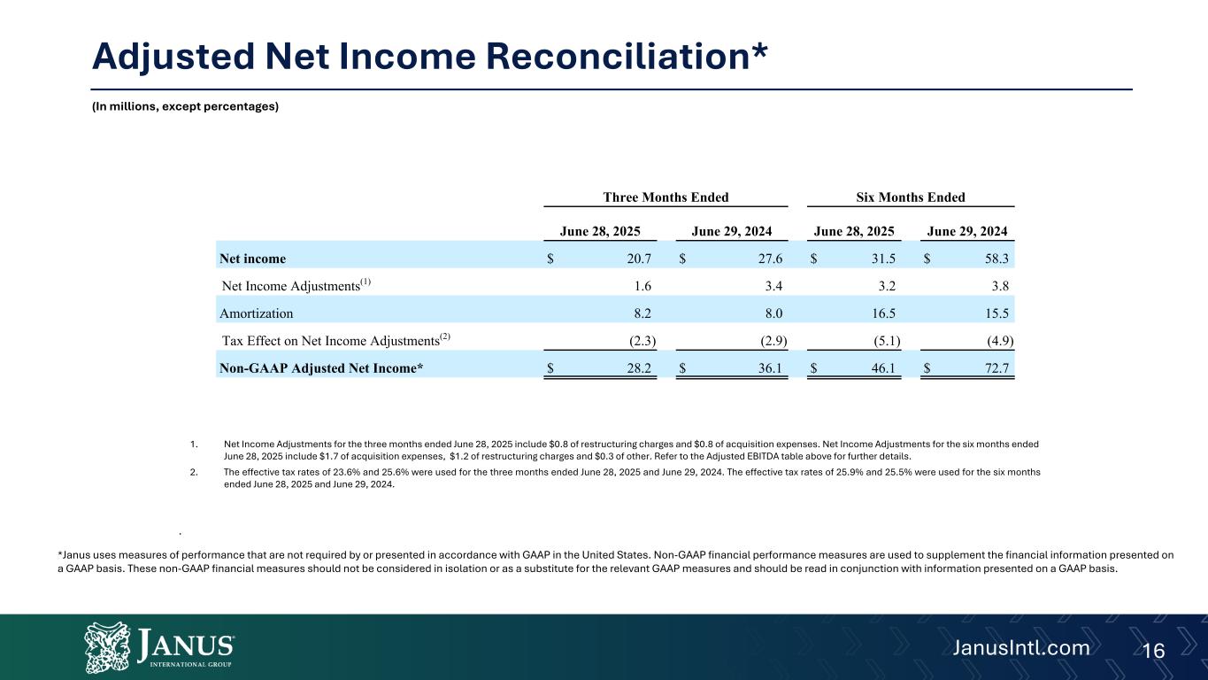 15JanusIntl.com Adjusted EBITDA Reconciliation* 1. Restructuring charges consist of the following: 1) facility relocations, 2) severance and hiring costs associated with our strategic transformation, including executive leadership team changes, and 3) strategic business assessment and transformation projects. 2. Expenses or income related to various professional fees, acquisition related compensation, net working capital finalization, legal settlements and various acquisition related activities. 3. Adjustment for loss on extinguishment and modification of debt regarding the write off of unamortized fees and third-party fees as a result of the debt modification completed in April 2024. . (In millions, except percentages) *Janus uses measures of performance that are not required by or presented in accordance with GAAP in the United States. Non-GAAP financial performance measures are used to supplement the financial information presented on a GAAP basis. These non-GAAP financial measures should not be considered in isolation or as a substitute for the relevant GAAP measures and should be read in conjunction with information presented on a GAAP basis. Three Months Ended Variance June 28, 2025 June 29, 2024 $ % Net income $ 20.7 $ 27.6 $ (6.9) (25.0) % Interest, net 9.1 13.0 (3.9) (30.0) % Income taxes 6.4 9.5 (3.1) (32.6) % Depreciation 3.0 3.0 — — % Amortization 8.2 8.0 0.2 2.5 % EBITDA* $ 47.4 $ 61.1 $ (13.7) (22.4) % Restructuring charges (1) 0.8 0.3 0.5 166.7 % Acquisition expense (2) 0.8 1.4 (0.6) (42.9) % Loss on extinguishment and modification of debt (3) — 1.7 (1.7) (100.0) % Adjusted EBITDA* $ 49.0 $ 64.5 $ (15.5) (24.0) % Six Months Ended Variance June 28, 2025 June 29, 2024 $ % Net income $ 31.5 $ 58.3 $ (26.8) (46.0) % Interest, net 19.3 27.3 (8.0) (29.3) % Income taxes 11.0 20.0 (9.0) (45.0) % Depreciation 5.9 5.9 — — % Amortization 16.5 15.5 1.0 6.5 % EBITDA* $ 84.2 $ 127.0 $ (42.8) (33.7) % Restructuring charges (1) 1.2 0.7 0.5 71.4 % Acquisition expense (2) 1.7 1.4 0.3 21.4 % Loss on extinguishment and modification of debt (3) — 1.7 (1.7) (100.0) % Other 0.3 — 0.3 — % Adjusted EBITDA* $ 87.4 $ 130.8 $ (43.4) (33.2) %