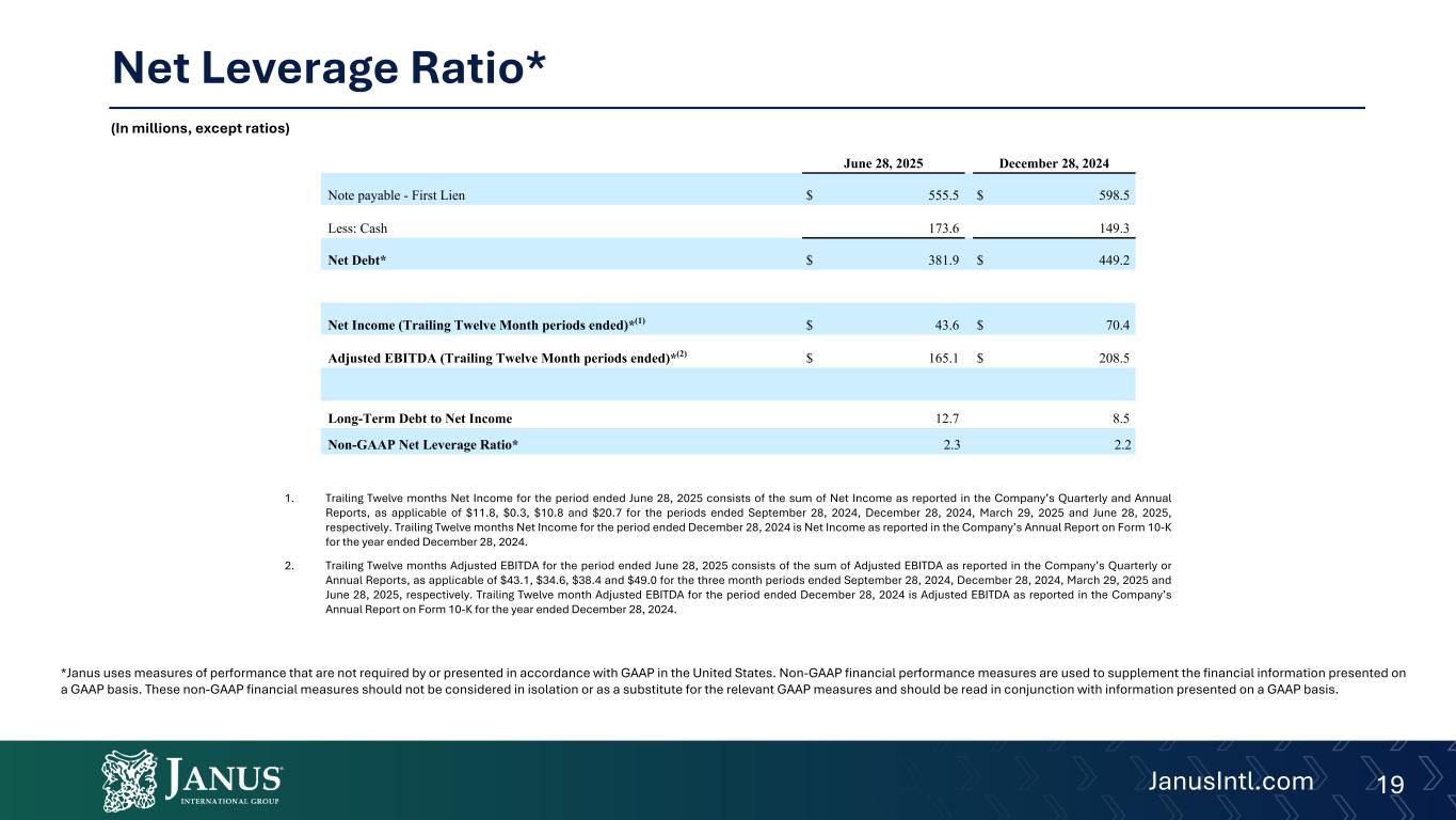 18JanusIntl.com Free Cash Flow Conversion* (In millions, except percentages) Trailing Twelve Months Ended June 28, 2025 June 29, 2024 Cash Flow from Operating Activities $ 194.1 $ 178.2 Less: Purchases of property, plant and equipment (23.0) (19.7) Free Cash Flow* $ 171.1 $ 158.5 Non-GAAP Adjusted Net Income*(1) $ 81.2 $ 158.8 Free Cash Flow Conversion of Non-GAAP Adjusted Net Income* 211 % 100 % Six Months Ended June 28, 2025 June 29, 2024 Cash Flow from Operating Activities $ 99.7 $ 59.6 Less: Purchases of property, plant and equipment (13.2) (10.3) Free Cash Flow* $ 86.5 $ 49.3 Non-GAAP Adjusted Net Income* $ 46.1 $ 72.7 Free Cash Flow Conversion of Non-GAAP Adjusted Net Income* 188 % 68 % *Janus uses measures of performance that are not required by or presented in accordance with GAAP in the United States. Non-GAAP financial performance measures are used to supplement the financial information presented on a GAAP basis. These non-GAAP financial measures should not be considered in isolation or as a substitute for the relevant GAAP measures and should be read in conjunction with information presented on a GAAP basis. 1. Trailing Twelve-month Adjusted Net Income for the period ended June 28, 2025 consists of the sum of Adjusted Net Income, of $21.8, $13.5, $17.7 and $28.2 for the periods ended September 28, 2024, December 28, 2024, March 29, 2025 and June 28, 2025, respectively. Trailing Twelve-month Adjusted Net Income for the period ended June 29, 2024 consists of the sum of Adjusted Net Income of $44.6, $41.5, $36.6 and $36.1 for the periods ended September 30, 2023, December 30, 2023, March 30, 2024 and June 29, 2024, respectively. Adjusted Net Income for the prior year has been adjusted to conform to the presentation and classifications used in the current year. These adjustments have no effect on our previously reported results.