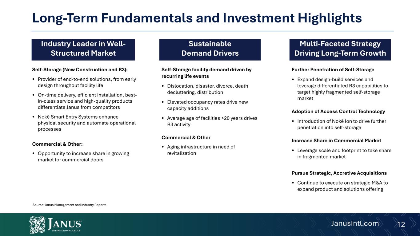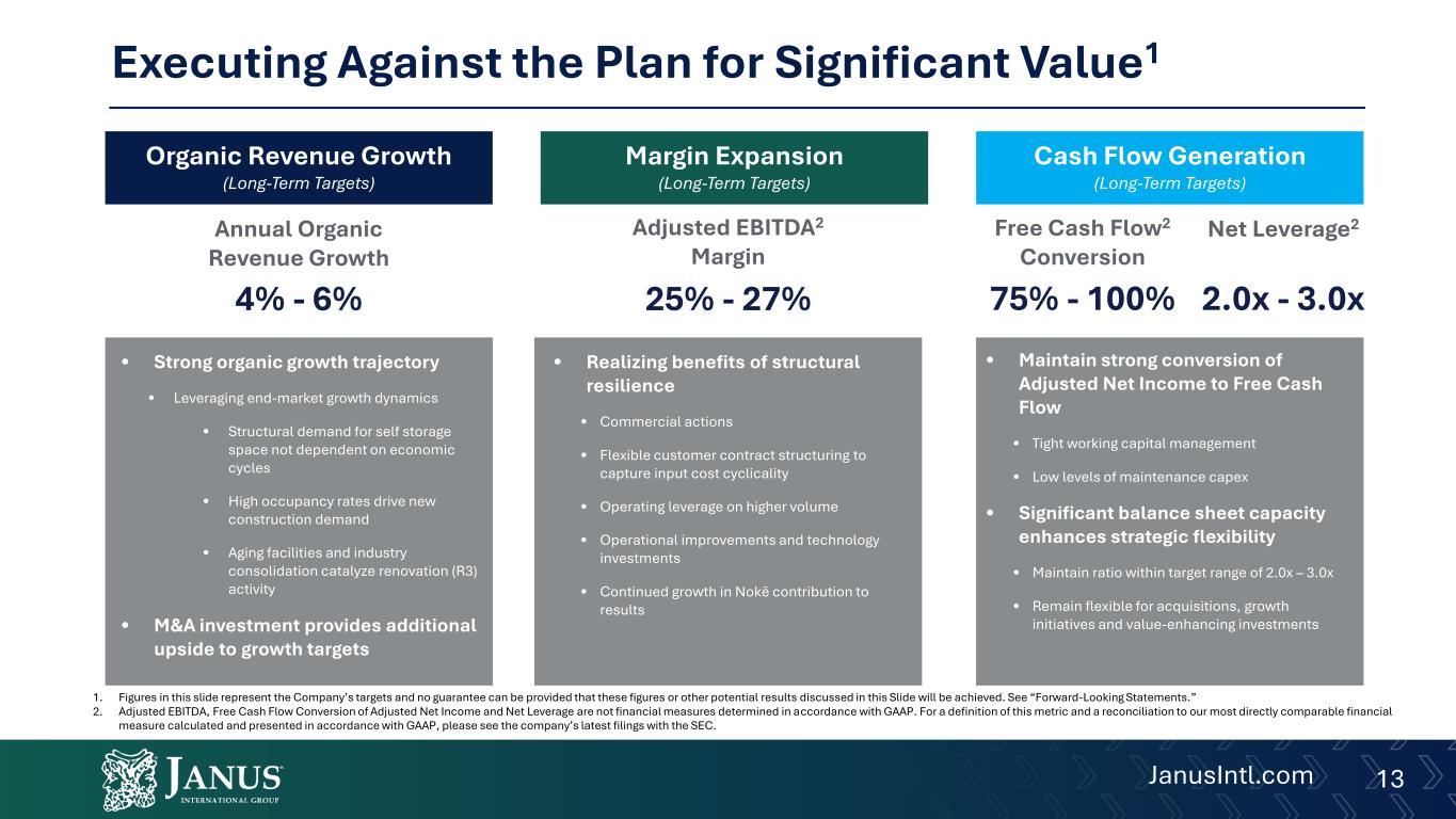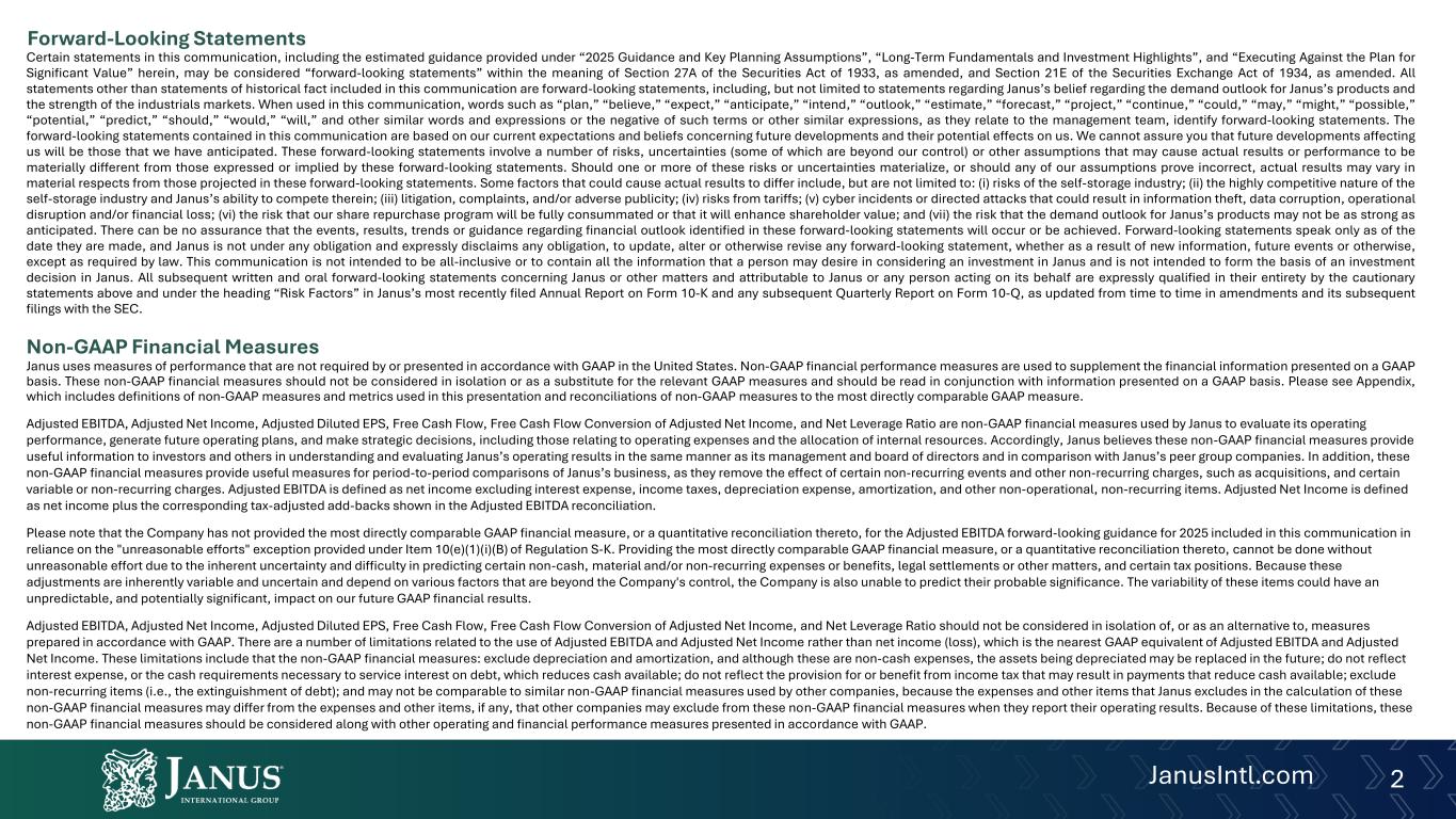 2JanusIntl.com Forward-Looking Statements Certain statements in this communication, including the estimated guidance provided under “2025 Guidance and Key Planning Assumptions”, “Long-Term Fundamentals and Investment Highlights”, and “Executing Against the Plan for Significant Value” herein, may be considered “forward-looking statements” within the meaning of Section 27A of the Securities Act of 1933, as amended, and Section 21E of the Securities Exchange Act of 1934, as amended. All statements other than statements of historical fact included in this communication are forward-looking statements, including, but not limited to statements regarding Janus’s belief regarding the demand outlook for Janus’s products and the strength of the industrials markets. When used in this communication, words such as “plan,” “believe,” “expect,” “anticipate,” “intend,” “outlook,” “estimate,” “forecast,” “project,” “continue,” “could,” “may,” “might,” “possible,” “potential,” “predict,” “should,” “would,” “will,” and other similar words and expressions or the negative of such terms or other similar expressions, as they relate to the management team, identify forward-looking statements. The forward-looking statements contained in this communication are based on our current expectations and beliefs concerning future developments and their potential effects on us. We cannot assure you that future developments affecting us will be those that we have anticipated. These forward-looking statements involve a number of risks, uncertainties (some of which are beyond our control) or other assumptions that may cause actual results or performance to be materially different from those expressed or implied by these forward-looking statements. Should one or more of these risks or uncertainties materialize, or should any of our assumptions prove incorrect, actual results may vary in material respects from those projected in these forward-looking statements. Some factors that could cause actual results to differ include, but are not limited to: (i) risks of the self-storage industry; (ii) the highly competitive nature of the self-storage industry and Janus’s ability to compete therein; (iii) litigation, complaints, and/or adverse publicity; (iv) risks from tariffs; (v) cyber incidents or directed attacks that could result in information theft, data corruption, operational disruption and/or financial loss; (vi) the risk that our share repurchase program will be fully consummated or that it will enhance shareholder value; and (vii) the risk that the demand outlook for Janus’s products may not be as strong as anticipated. There can be no assurance that the events, results, trends or guidance regarding financial outlook identified in these forward-looking statements will occur or be achieved. Forward-looking statements speak only as of the date they are made, and Janus is not under any obligation and expressly disclaims any obligation, to update, alter or otherwise revise any forward-looking statement, whether as a result of new information, future events or otherwise, except as required by law. This communication is not intended to be all-inclusive or to contain all the information that a person may desire in considering an investment in Janus and is not intended to form the basis of an investment decision in Janus. All subsequent written and oral forward-looking statements concerning Janus or other matters and attributable to Janus or any person acting on its behalf are expressly qualified in their entirety by the cautionary statements above and under the heading “Risk Factors” in Janus’s most recently filed Annual Report on Form 10-K and any subsequent Quarterly Report on Form 10-Q, as updated from time to time in amendments and its subsequent filings with the SEC. Non-GAAP Financial Measures Janus uses measures of performance that are not required by or presented in accordance with GAAP in the United States. Non-GAAP financial performance measures are used to supplement the financial information presented on a GAAP basis. These non-GAAP financial measures should not be considered in isolation or as a substitute for the relevant GAAP measures and should be read in conjunction with information presented on a GAAP basis. Please see Appendix, which includes definitions of non-GAAP measures and metrics used in this presentation and reconciliations of non-GAAP measures to the most directly comparable GAAP measure. Adjusted EBITDA, Adjusted Net Income, Adjusted Diluted EPS, Free Cash Flow, Free Cash Flow Conversion of Adjusted Net Income, and Net Leverage Ratio are non-GAAP financial measures used by Janus to evaluate its operating performance, generate future operating plans, and make strategic decisions, including those relating to operating expenses and the allocation of internal resources. Accordingly, Janus believes these non-GAAP financial measures provide useful information to investors and others in understanding and evaluating Janus’s operating results in the same manner as its management and board of directors and in comparison with Janus’s peer group companies. In addition, these non-GAAP financial measures provide useful measures for period-to-period comparisons of Janus’s business, as they remove the effect of certain non-recurring events and other non-recurring charges, such as acquisitions, and certain variable or non-recurring charges. Adjusted EBITDA is defined as net income excluding interest expense, income taxes, depreciation expense, amortization, and other non-operational, non-recurring items. Adjusted Net Income is defined as net income plus the corresponding tax-adjusted add-backs shown in the Adjusted EBITDA reconciliation. Please note that the Company has not provided the most directly comparable GAAP financial measure, or a quantitative reconciliation thereto, for the Adjusted EBITDA forward-l