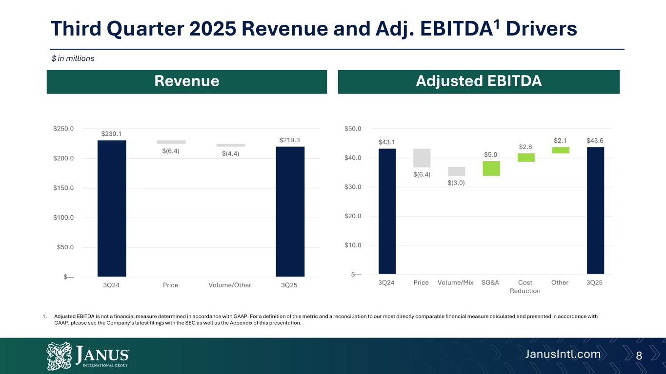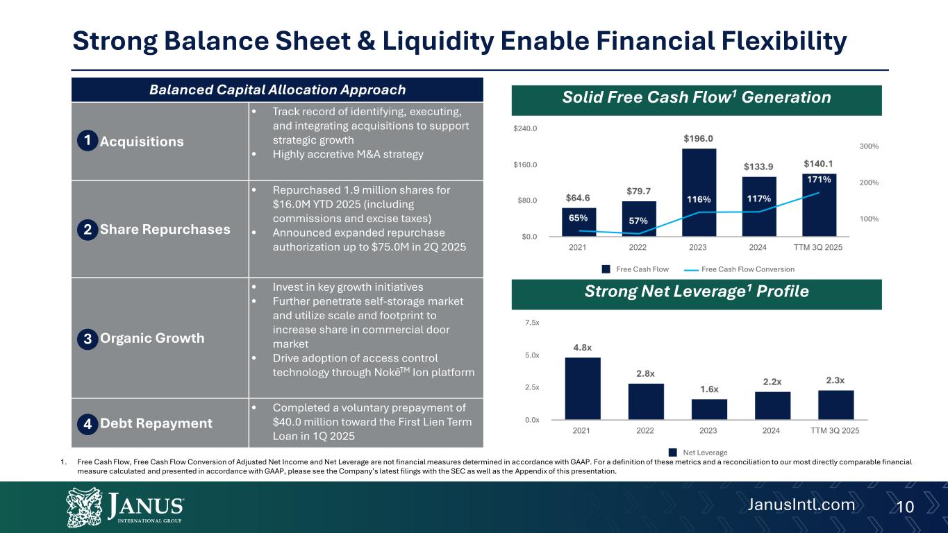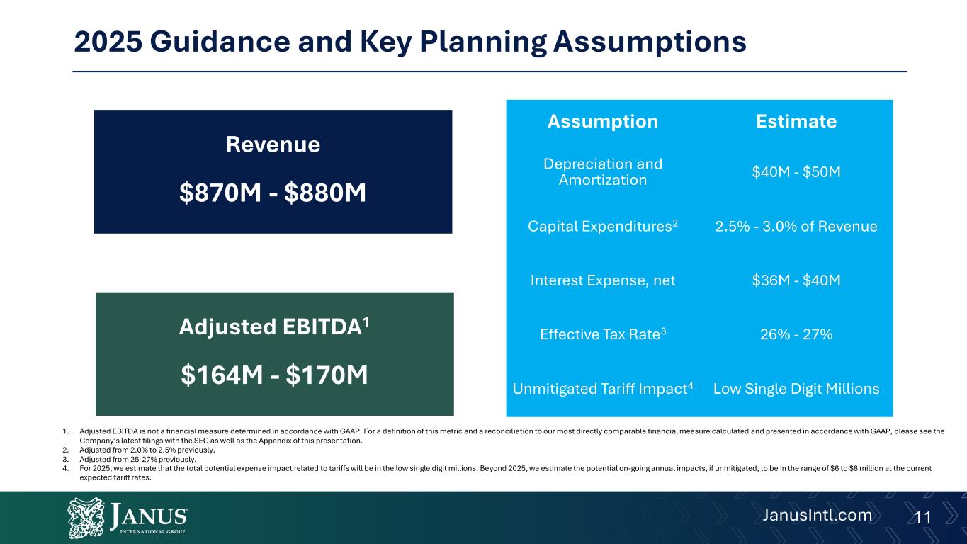 2JanusIntl.com Forward-Looking Statements Certain statements in this communication, including the estimated guidance provided under “2025 Guidance and Key Planning Assumptions”, “Long-Term Fundamentals and Investment Highlights”, and “Executing Against the Plan for Significant Value” herein, may be considered “forward-looking statements” within the meaning of Section 27A of the Securities Act of 1933, as amended, and Section 21E of the Securities Exchange Act of 1934, as amended. All statements other than statements of historical fact included in this communication are forward-looking statements, including, but not limited to statements regarding Janus’s belief regarding the demand outlook for Janus’s products and the strength of the industrials markets. When used in this communication, words such as “plan,” “believe,” “expect,” “anticipate,” “intend,” “outlook,” “estimate,” “forecast,” “project,” “continue,” “could,” “may,” “might,” “possible,” “potential,” “predict,” “should,” “would,” “will,” and other similar words and expressions or the negative of such terms or other similar expressions, as they relate to the management team, identify forward-looking statements. The forward-looking statements contained in this communication are based on our current expectations and beliefs concerning future developments and their potential effects on us. We cannot assure you that future developments affecting us will be those that we have anticipated. These forward-looking statements involve a number of risks, uncertainties (some of which are beyond our control) or other assumptions that may cause actual results or performance to be materially different from those expressed or implied by these forward-looking statements. Should one or more of these risks or uncertainties materialize, or should any of our assumptions prove incorrect, actual results may vary in material respects from those projected in these forward-looking statements. Some factors that could cause actual results to differ include, but are not limited to: (i) risks of the self-storage industry; (ii) the highly competitive nature of the self-storage industry and Janus’s ability to compete therein; (iii) litigation, complaints, and/or adverse publicity; (iv) risks from tariffs; (v) cyber incidents or directed attacks that could result in information theft, data corruption, operational disruption and/or financial loss; (vi) the risk that our share repurchase program will be fully consummated or that it will enhance shareholder value; and (vii) the risk that the demand outlook for Janus’s products may not be as strong as anticipated. There can be no assurance that the events, results, trends or guidance regarding financial outlook identified in these forward-looking statements will occur or be achieved. Forward-looking statements speak only as of the date they are made, and Janus is not under any obligation and expressly disclaims any obligation, to update, alter or otherwise revise any forward-looking statement, whether as a result of new information, future events or otherwise, except as required by law. This communication is not intended to be all-inclusive or to contain all the information that a person may desire in considering an investment in Janus and is not intended to form the basis of an investment decision in Janus. All subsequent written and oral forward-looking statements concerning Janus or other matters and attributable to Janus or any person acting on its behalf are expressly qualified in their entirety by the cautionary statements above and under the heading “Risk Factors” in Janus’s most recently filed Annual Report on Form 10-K and any subsequent Quarterly Report on Form 10-Q, as updated from time to time in amendments and its subsequent filings with the SEC. Non-GAAP Financial Measures Janus uses measures of performance that are not required by or presented in accordance with GAAP in the United States. Non-GAAP financial performance measures are used to supplement the financial information presented on a GAAP basis. These non-GAAP financial measures should not be considered in isolation or as a substitute for the relevant GAAP measures and should be read in conjunction with information presented on a GAAP basis. Please see Appendix, which includes definitions of non-GAAP measures and metrics used in this presentation and reconciliations of non-GAAP measures to the most directly comparable GAAP measure. Adjusted EBITDA, Adjusted Net Income, Adjusted Diluted EPS, Free Cash Flow, Free Cash Flow Conversion of Adjusted Net Income, and Net Leverage Ratio are non-GAAP financial measures used by Janus to evaluate its operating performance, generate future operating plans, and make strategic decisions, including those relating to operating expenses and the allocation of internal resources. Accordingly, Janus believes these non-GAAP financial measures provide useful information to investors and others in understanding and evaluating Janus’s operating results in the same manner as its management and board of directors and in comparison with Janus’s peer group companies. In addition, these non-GAAP financial measures provide useful measures for period-to-period comparisons of Janus’s business, as they remove the effect of certain non-recurring events and other non-recurring charges, such as acquisitions, and certain variable or non-recurring charges. Adjusted EBITDA is defined as net income excluding interest expense, income taxes, depreciation expense, amortization, and other non-operational, non-recurring items. Adjusted Net Income is defined as net income plus the corresponding tax-adjusted add-backs shown in the Adjusted EBITDA reconciliation. Please note that the Company has not provided the most directly comparable GAAP financial measure, or a quantitative reconciliation thereto, for the Adjusted EBITDA forward-l