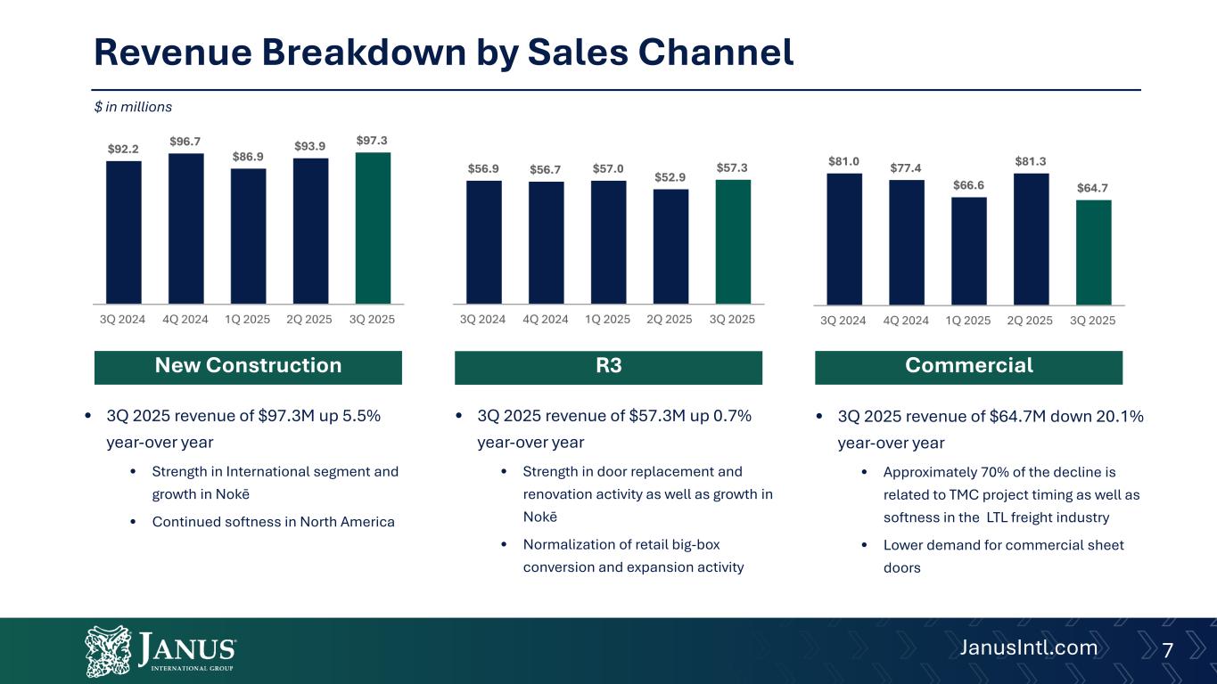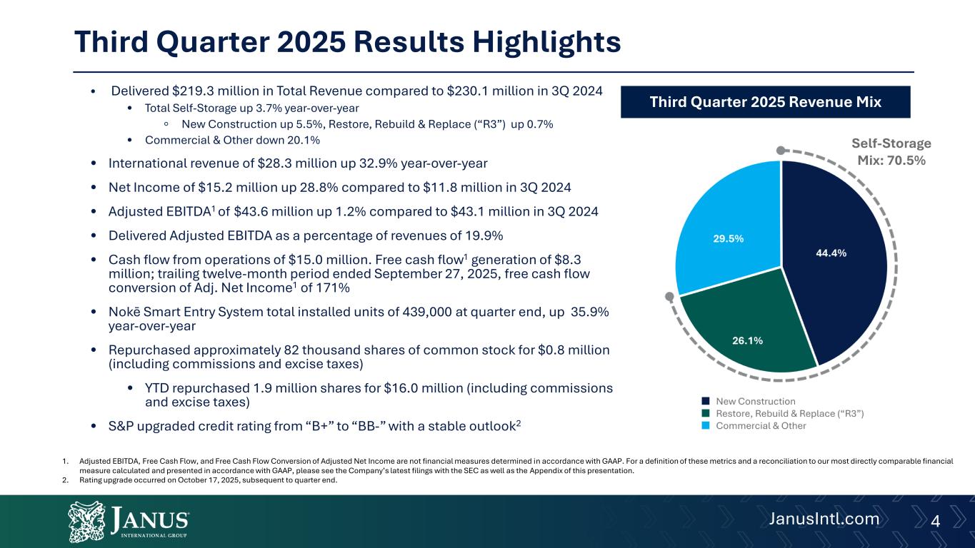 4JanusIntl.com Third Quarter 2025 Results Highlights • Delivered $219.3 million in Total Revenue compared to $230.1 million in 3Q 2024 • Total Self-Storage up 3.7% year-over-year ◦ New Construction up 5.5%, Restore, Rebuild & Replace (“R3”) up 0.7% • Commercial & Other down 20.1% • International revenue of $28.3 million up 32.9% year-over-year • Net Income of $15.2 million up 28.8% compared to $11.8 million in 3Q 2024 • Adjusted EBITDA1 of $43.6 million up 1.2% compared to $43.1 million in 3Q 2024 • Delivered Adjusted EBITDA as a percentage of revenues of 19.9% • Cash flow from operations of $15.0 million. Free cash flow1 generation of $8.3 million; trailing twelve-month period ended September 27, 2025, free cash flow conversion of Adj. Net Income1 of 171% • Nokē Smart Entry System total installed units of 439,000 at quarter end, up 35.9% year-over-year • Repurchased approximately 82 thousand shares of common stock for $0.8 million (including commissions and excise taxes) • YTD repurchased 1.9 million shares for $16.0 million (including commissions and excise taxes) • S&P upgraded credit rating from “B+” to “BB-” with a stable outlook2 Third Quarter 2025 Revenue Mix Self-Storage Mix: 70.5% 1. Adjusted EBITDA, Free Cash Flow, and Free Cash Flow Conversion of Adjusted Net Income are not financial measures determined in accordance with GAAP. For a definition of these metrics and a reconciliation to our most directly comparable financial measure calculated and presented in accordance with GAAP, please see the Company’s latest filings with the SEC as well as the Appendix of this presentation. 2. Rating upgrade occurred on October 17, 2025, subsequent to quarter end.
