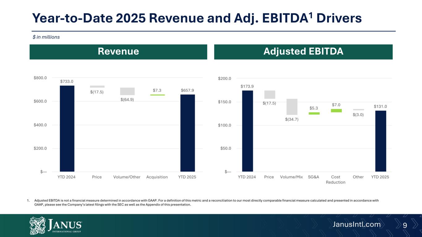 8JanusIntl.com Third Quarter 2025 Revenue and Adj. EBITDA1 Drivers Revenue Adjusted EBITDA 1. Adjusted EBITDA is not a financial measure determined in accordance with GAAP. For a definition of this metric and a reconciliation to our most directly comparable financial measure calculated and presented in accordance with GAAP, please see the Company’s latest filings with the SEC as well as the Appendix of this presentation. $ in millions