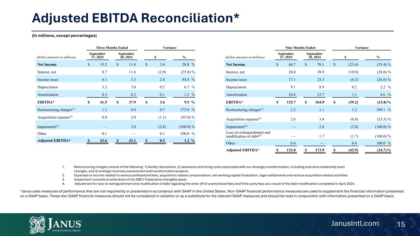15JanusIntl.com Adjusted EBITDA Reconciliation* 1. Restructuring charges consist of the following: 1) facility relocations, 2) severance and hiring costs associated with our strategic transformation, including executive leadership team changes, and 3) strategic business assessment and transformation projects. 2. Expenses or income related to various professional fees, acquisition related compensation, net working capital finalization, legal settlements and various acquisition related activities. 3. Impairment consists of write down of the DBCI Tradename intangible asset. 4. Adjustment for loss on extinguishment and modification of debt regarding the write off of unamortized fees and third-party fees as a result of the debt modification completed in April 2024. . (In millions, except percentages) *Janus uses measures of performance that are not required by or presented in accordance with GAAP in the United States. Non-GAAP financial performance measures are used to supplement the financial information presented on a GAAP basis. These non-GAAP financial measures should not be considered in isolation or as a substitute for the relevant GAAP measures and should be read in conjunction with information presented on a GAAP basis. Three Months Ended Variance (dollar amounts in millions) September 27, 2025 September 28, 2024 $ % Net Income $ 15.2 $ 11.8 $ 3.4 28.8 % Interest, net 8.7 11.6 (2.9) (25.0) % Income taxes 6.1 3.3 2.8 84.8 % Depreciation 3.2 3.0 0.2 6.7 % Amortization 8.3 8.2 0.1 1.2 % EBITDA* $ 41.5 $ 37.9 $ 3.6 9.5 % Restructuring charges(1) 1.1 0.4 0.7 175.0 % Acquisition expense(2) 0.9 2.0 (1.1) (55.0) % Impairment(3) — 2.8 (2.8) (100.0) % Other 0.1 — 0.1 100.0 % Adjusted EBITDA* $ 43.6 $ 43.1 $ 0.5 1.2 % Nine Months Ended Variance (dollar amounts in millions) September 27, 2025 September 28, 2024 $ % Net Income $ 46.7 $ 70.1 $ (23.4) (33.4) % Interest, net 28.0 38.9 (10.9) (28.0) % Income taxes 17.1 23.3 (6.2) (26.6) % Depreciation 9.1 8.9 0.2 2.2 % Amortization 24.8 23.7 1.1 4.6 % EBITDA* $ 125.7 $ 164.9 $ (39.2) (23.8)% Restructuring charges(1) 2.3 1.1 1.2 109.1 % Acquisition expense(2) 2.6 3.4 (0.8) (23.5) % Impairment(3) — 2.8 (2.8) (100.0) % Loss on extinguishment and modification of debt(4) — 1.7 (1.7) (100.0) % Other 0.4 — 0.4 100.0 % Adjusted EBITDA* $ 131.0 $ 173.9 $ (42.9) (24.7)%