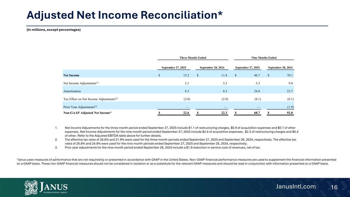 16JanusIntl.com Adjusted Net Income Reconciliation* (In millions, except percentages) Three Months Ended Nine Months Ended September 27, 2025 September 28, 2024 September 27, 2025 September 28, 2024 Net Income $ 15.2 $ 11.8 $ 46.7 $ 70.1 Net Income Adjustments(1) 2.1 5.2 5.3 9.0 Amortization 8.3 8.2 24.8 23.7 Tax Effect on Net Income Adjustments(2) (3.0) (2.9) (8.1) (8.1) Prior Year Adjustments(3) — — — (1.9) Non-GAAP Adjusted Net Income* $ 22.6 $ 22.3 $ 68.7 $ 92.8 1. Net Income Adjustments for the three month period ended September 27, 2025 include $1.1 of restructuring charges, $0.9 of acquisition expenses and $0.1 of other expenses. Net Income Adjustments for the nine month period ended September 27, 2025 include $2.6 of acquisition expenses, $2.3 of restructuring charges and $0.4 of other. Refer to the Adjusted EBITDA table above for further details. 2. The effective tax rates of 28.6% and 21.9% were used for the three month periods ended September 27, 2025 and September 28, 2024, respectively. The effective tax rates of 26.8% and 24.9% were used for the nine month periods ended September 27, 2025 and September 28, 2024, respectively. 3. Prior year adjustments for the nine month period ended September 28, 2024 include a $1.9 reduction in service cost of revenues, net of tax. . *Janus uses measures of performance that are not required by or presented in accordance with GAAP in the United States. Non-GAAP financial performance measures are used to supplement the financial information presented on a GAAP basis. These non-GAAP financial measures should not be considered in isolation or as a substitute for the relevant GAAP measures and should be read in conjunction with information presented on a GAAP basis.