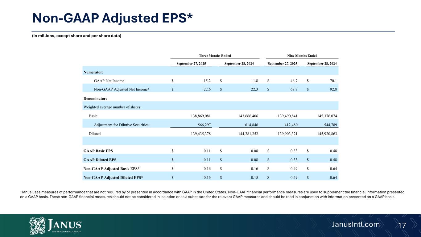 17JanusIntl.com Non-GAAP Adjusted EPS* (In millions, except share and per share data) Three Months Ended Nine Months Ended September 27, 2025 September 28, 2024 September 27, 2025 September 28, 2024 Numerator: GAAP Net Income $ 15.2 $ 11.8 $ 46.7 $ 70.1 Non-GAAP Adjusted Net Income* $ 22.6 $ 22.3 $ 68.7 $ 92.8 Denominator: Weighted average number of shares: Basic 138,869,081 143,666,406 139,490,841 145,376,074 Adjustment for Dilutive Securities 566,297 614,846 412,480 544,789 Diluted 139,435,378 144,281,252 139,903,321 145,920,863 GAAP Basic EPS $ 0.11 $ 0.08 $ 0.33 $ 0.48 GAAP Diluted EPS $ 0.11 $ 0.08 $ 0.33 $ 0.48 Non-GAAP Adjusted Basic EPS* $ 0.16 $ 0.16 $ 0.49 $ 0.64 Non-GAAP Adjusted Diluted EPS* $ 0.16 $ 0.15 $ 0.49 $ 0.64 *Janus uses measures of performance that are not required by or presented in accordance with GAAP in the United States. Non-GAAP financial performance measures are used to supplement the financial information presented on a GAAP basis. These non-GAAP financial measures should not be considered in isolation or as a substitute for the relevant GAAP measures and should be read in conjunction with information presented on a GAAP basis.