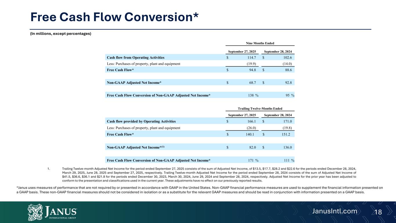 18JanusIntl.com Free Cash Flow Conversion* (In millions, except percentages) Nine Months Ended September 27, 2025 September 28, 2024 Cash flow from Operating Activities $ 114.7 $ 102.6 Less: Purchases of property, plant and equipment (19.9) (14.0) Free Cash Flow* $ 94.8 $ 88.6 Non-GAAP Adjusted Net Income* $ 68.7 $ 92.8 Free Cash Flow Conversion of Non-GAAP Adjusted Net Income* 138 % 95 % Trailing Twelve-Months Ended September 27, 2025 September 28, 2024 Cash flow provided by Operating Activities $ 166.1 $ 171.0 Less: Purchases of property, plant and equipment (26.0) (19.8) Free Cash Flow* $ 140.1 $ 151.2 Non-GAAP Adjusted Net Income*(1) $ 82.0 $ 136.0 Free Cash Flow Conversion of Non-GAAP Adjusted Net Income* 171 % 111 % *Janus uses measures of performance that are not required by or presented in accordance with GAAP in the United States. Non-GAAP financial performance measures are used to supplement the financial information presented on a GAAP basis. These non-GAAP financial measures should not be considered in isolation or as a substitute for the relevant GAAP measures and should be read in conjunction with information presented on a GAAP basis. 1. Trailing Twelve-month Adjusted Net Income for the period ended September 27, 2025 consists of the sum of Adjusted Net Income, of $13.5, $17.7, $28.2 and $22.6 for the periods ended December 28, 2024, March 29, 2025, June 28, 2025 and September 27, 2025, respectively. Trailing Twelve-month Adjusted Net Income for the period ended September 28, 2024 consists of the sum of Adjusted Net Income of $41.5, $36.6, $36.1 and $21.8 for the periods ended December 30, 2023, March 30, 2024, June 29, 2024 and September 28, 2024, respectively. Adjusted Net Income for the prior year has been adjusted to conform to the presentation and classifications used in the current year. These adjustments have no effect on our previously reported results.