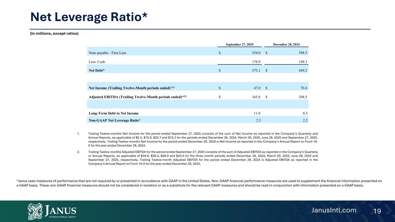 19JanusIntl.com Net Leverage Ratio* (In millions, except ratios) *Janus uses measures of performance that are not required by or presented in accordance with GAAP in the United States. Non-GAAP financial performance measures are used to supplement the financial information presented on a GAAP basis. These non-GAAP financial measures should not be considered in isolation or as a substitute for the relevant GAAP measures and should be read in conjunction with information presented on a GAAP basis. September 27, 2025 December 28, 2024 Note payable - First Lien $ 554.0 $ 598.5 Less: Cash 178.9 149.3 Net Debt* $ 375.1 $ 449.2 Net Income (Trailing Twelve-Month periods ended)*(1) $ 47.0 $ 70.4 Adjusted EBITDA (Trailing Twelve-Month periods ended)*(2) $ 165.6 $ 208.5 Long-Term Debt to Net Income 11.8 8.5 Non-GAAP Net Leverage Ratio* 2.3 2.2 1. Trailing Twelve-months Net Income for the period ended September 27, 2025 consists of the sum of Net Income as reported in the Company’s Quarterly and Annual Reports, as applicable of $0.3, $10.8, $20.7 and $15.2 for the periods ended December 28, 2024, March 29, 2025, June 28, 2025 and September 27, 2025, respectively. Trailing Twelve-months Net Income for the period ended December 28, 2024 is Net Income as reported in the Company’s Annual Report on Form 10- K for the year ended December 28, 2024. 2. Trailing Twelve-months Adjusted EBITDA for the period ended September 27, 2025 consists of the sum of Adjusted EBITDA as reported in the Company’s Quarterly or Annual Reports, as applicable of $34.6, $38.4, $49.0 and $43.6 for the three month periods ended December 28, 2024, March 29, 2025, June 28, 2025 and September 27, 2025, respectively. Trailing Twelve-month Adjusted EBITDA for the period ended December 28, 2024 is Adjusted EBITDA as reported in the Company’s Annual Report on Form 10-K for the year ended December 28, 2024.